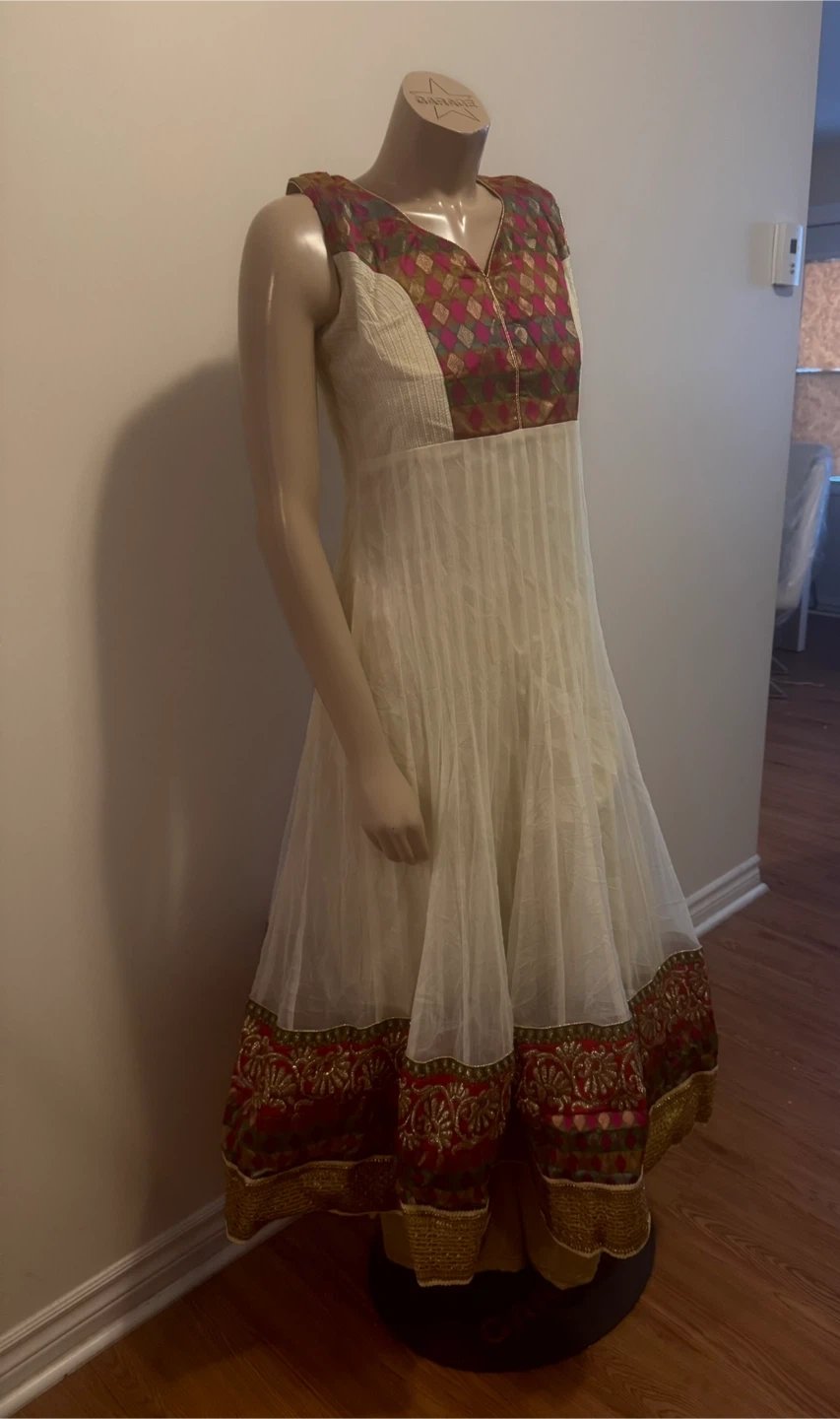 This is a sleeveless Anarkali dress in white. It features a colourful patterned yoke and a richly embroidered border at the hem. The dress has a flowing, pleated skirt made of sheer fabric over an opaque lining. It's elegant for special occasions!