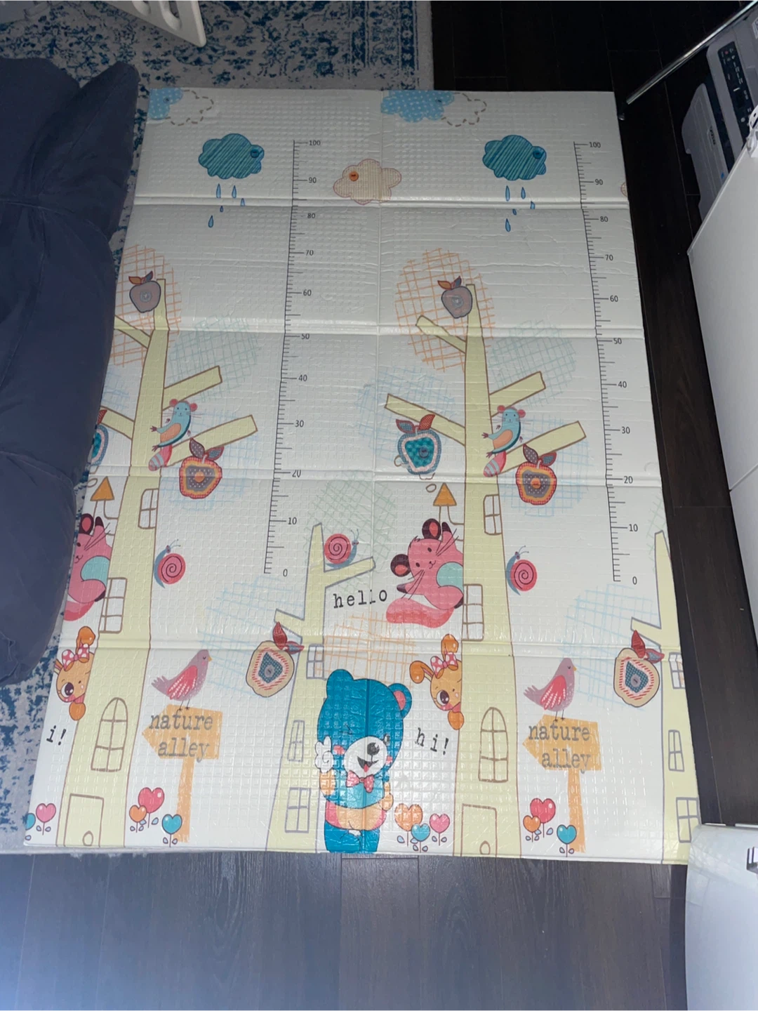 A foldable foam play mat! We used it when hosting play dates at restaurants and party rooms. Super useful for littles not yet walking. Easy to clean and fold to store. Cleaned and ready for a new home.