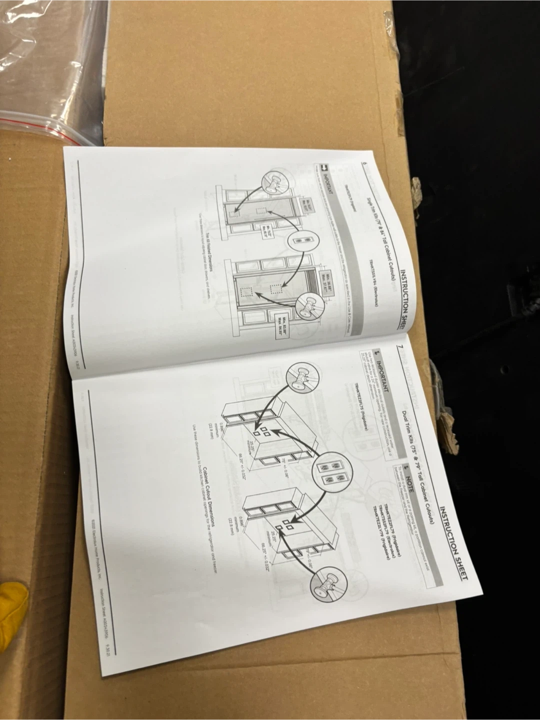 Includes instructions and hardware for dual track kits. Designed for 79" full cabinets. Box is included and shows wear. All components appear to be present.