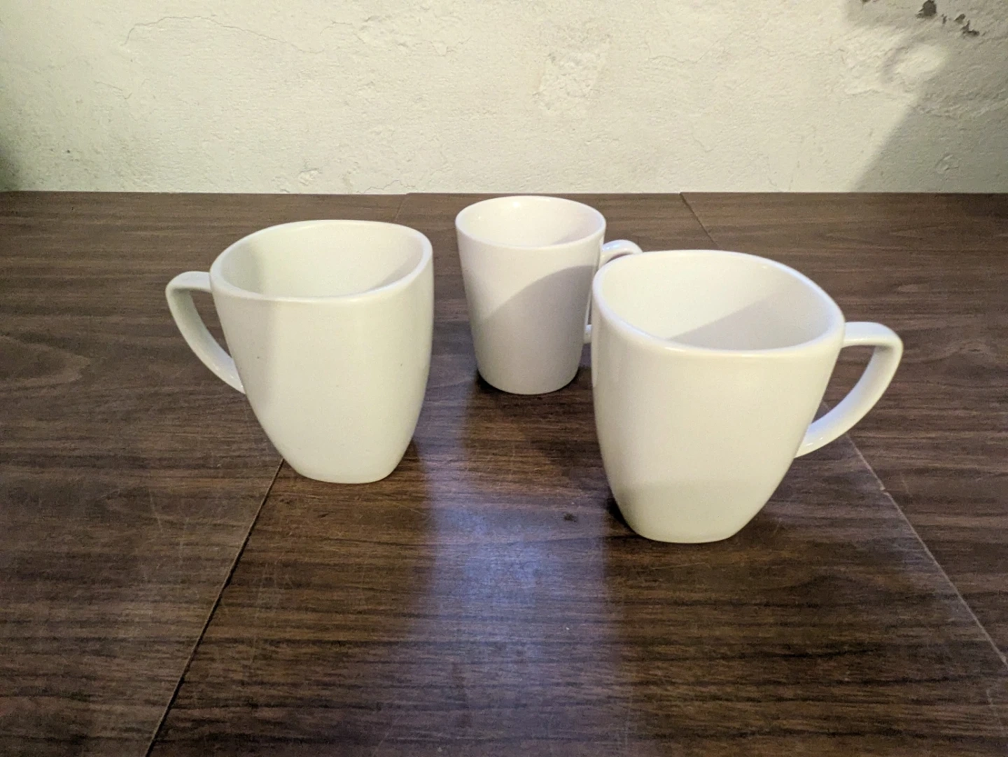 Three white ceramic mugs, perfect for your morning coffee or tea. These sturdy mugs have a classic design and a comfortable handle. Dishwasher and microwave safe.