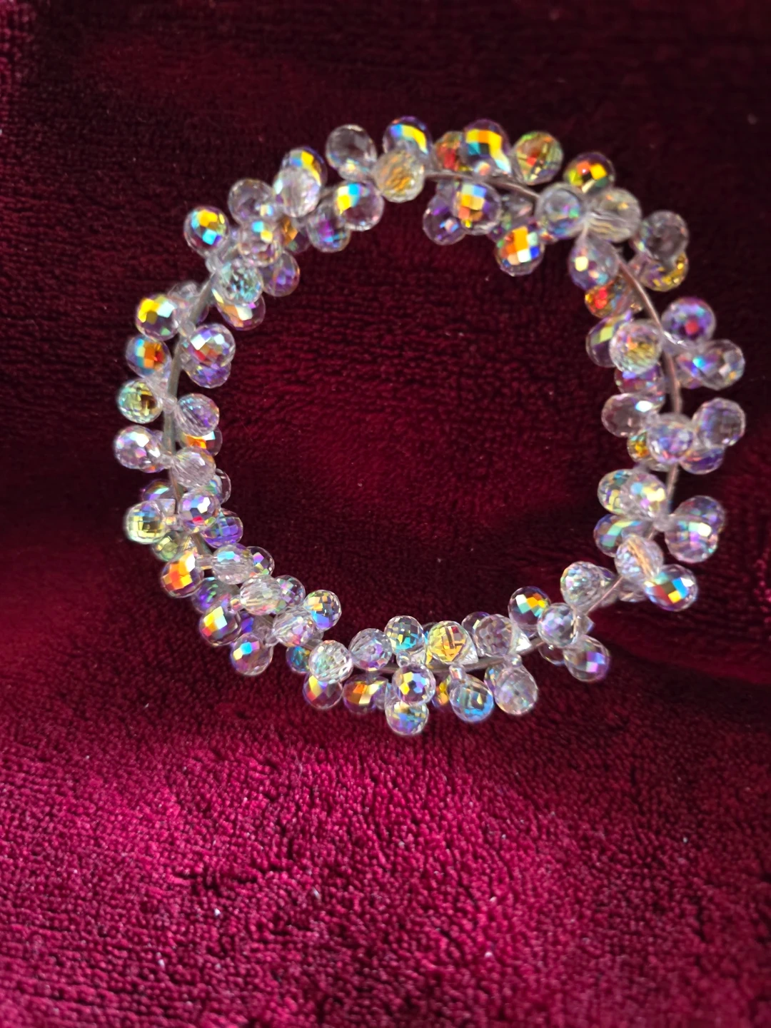 This is a lovely bracelet made with clear, iridescent beads. It's strung together on clear cord, creating a delicate floral pattern. A beautiful accessory for any occasion!
