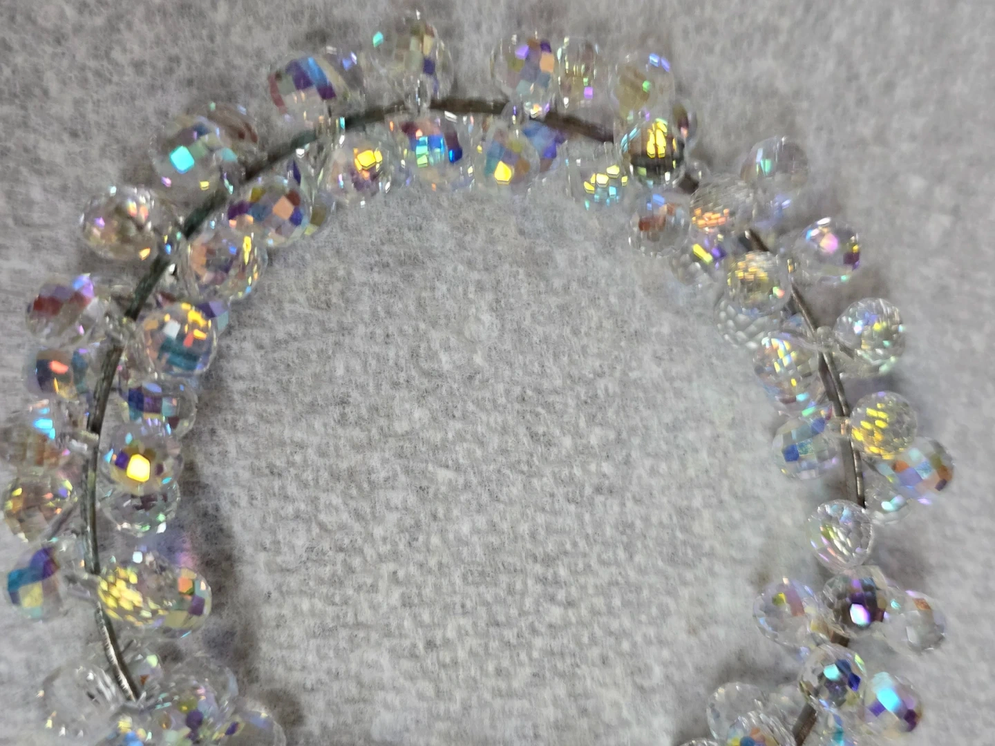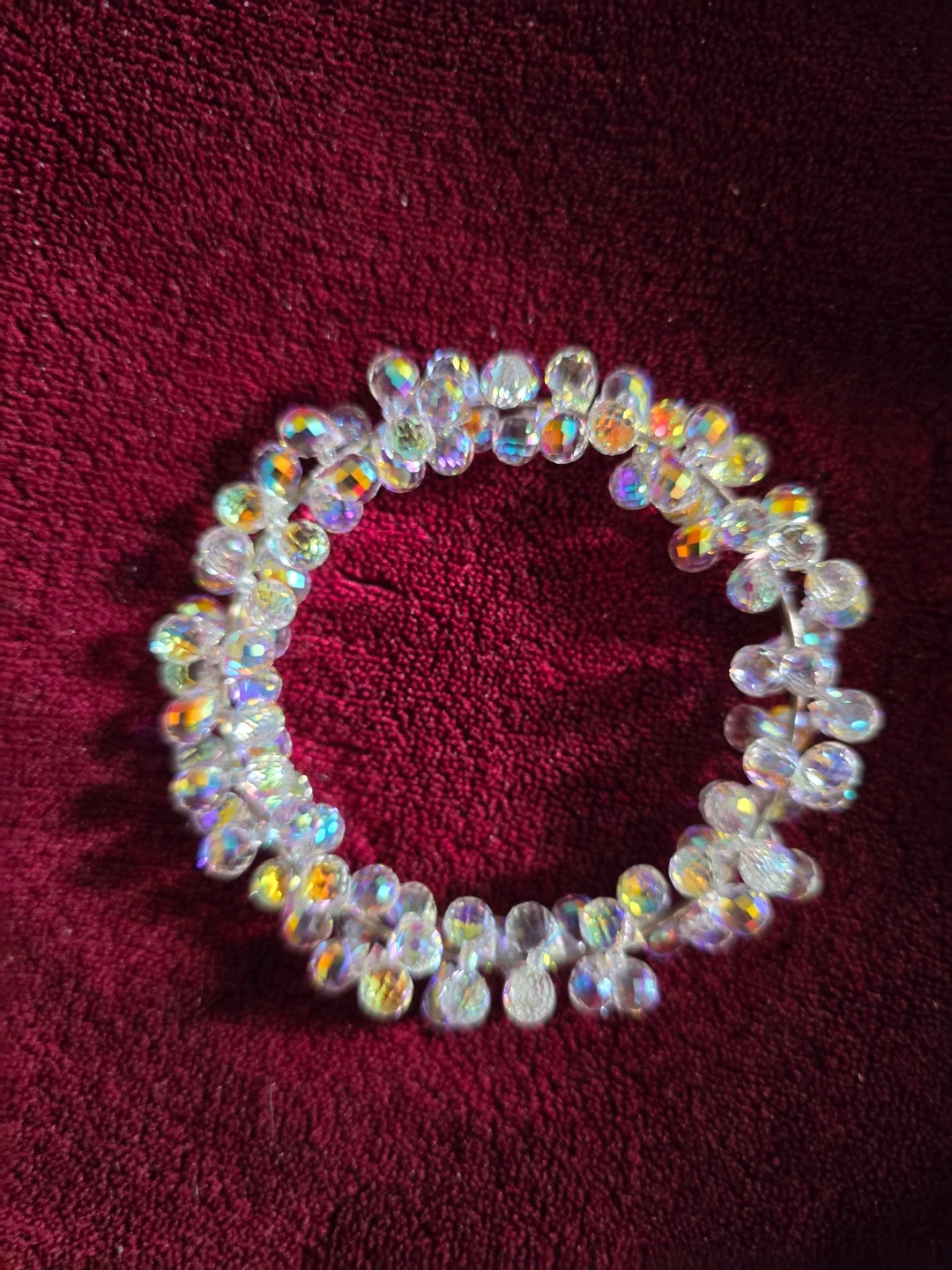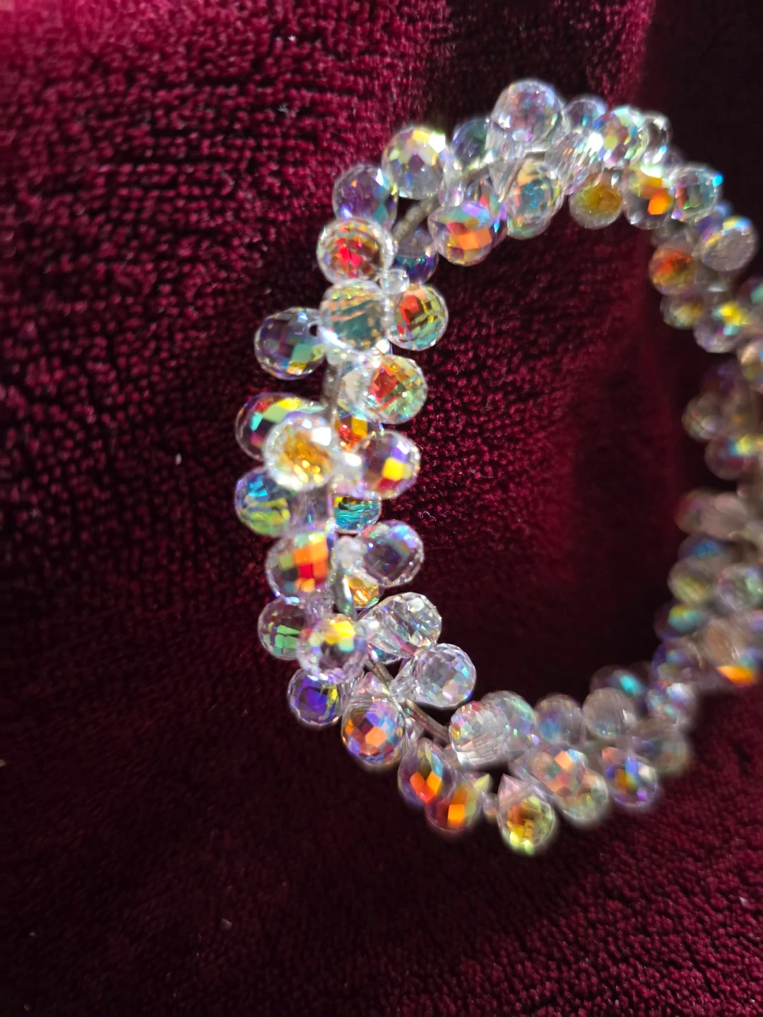 This is a lovely bracelet made with clear, iridescent beads. It's strung together on clear cord, creating a delicate floral pattern. A beautiful accessory for any occasion!