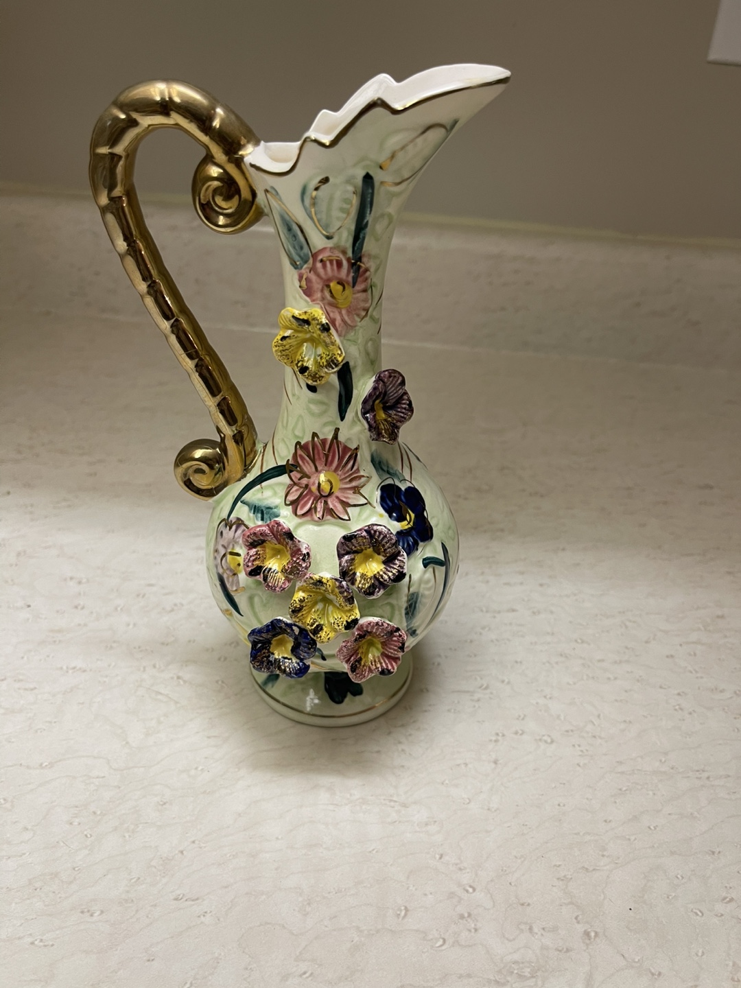 This is a lovely vintage ceramic pitcher featuring a delicate floral design and a gold-tone handle. It would make a beautiful addition to any home decor. 8.5”. Cash only
