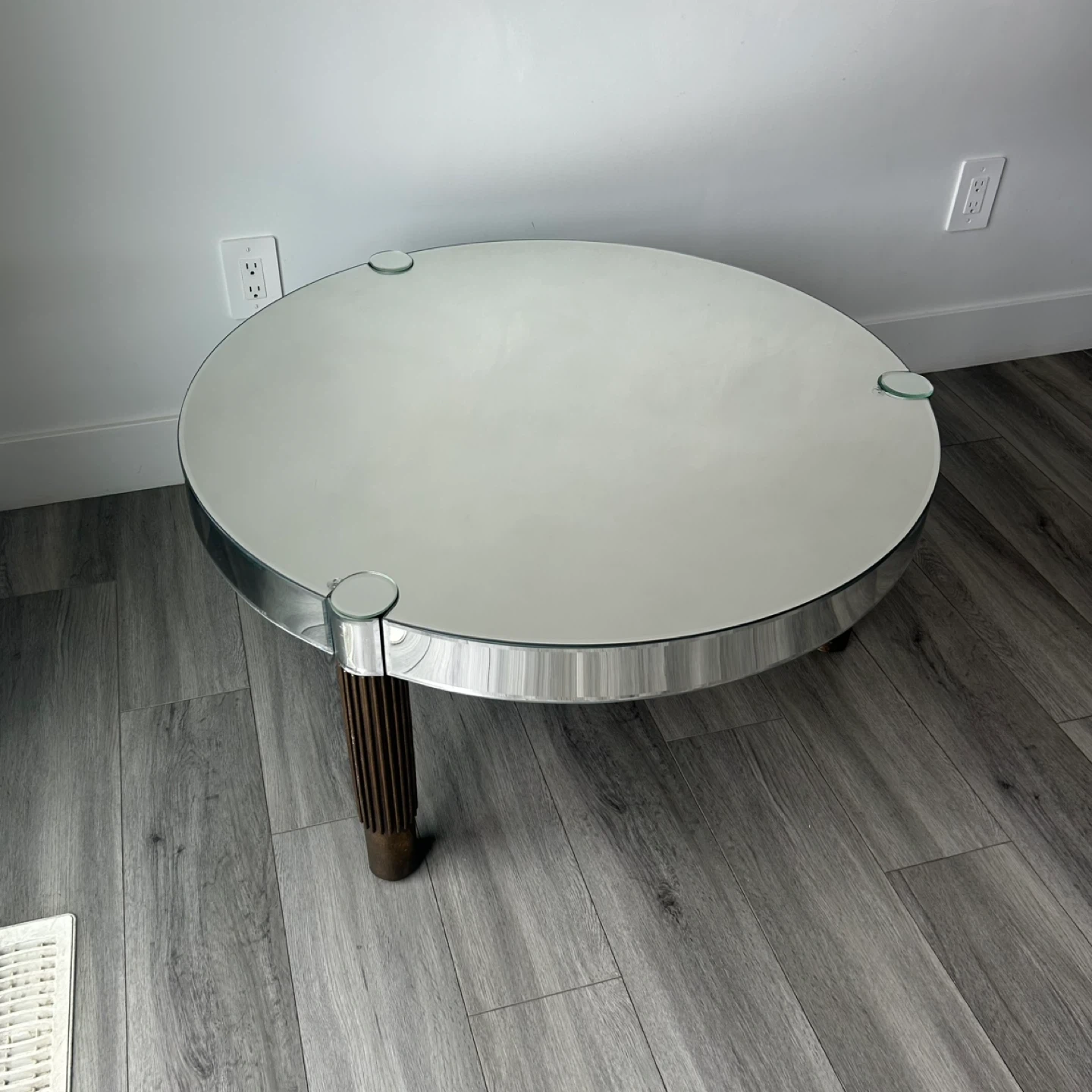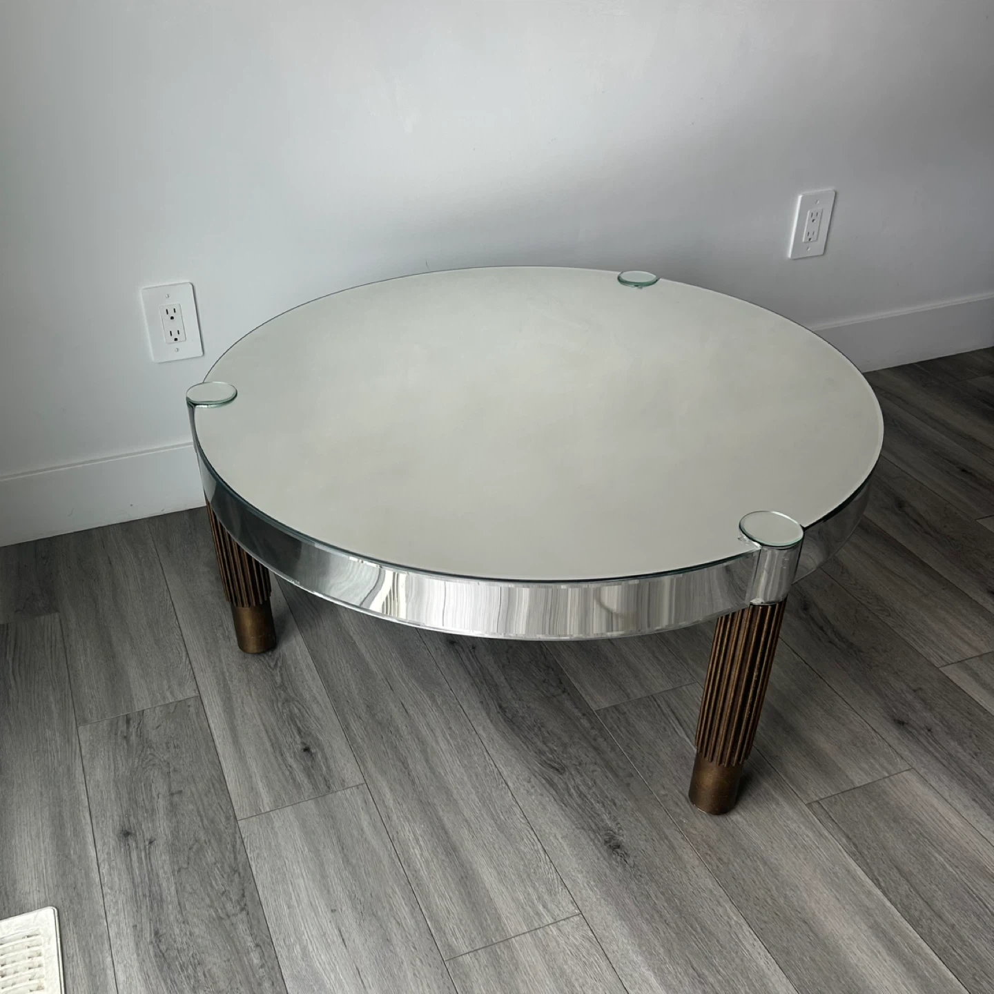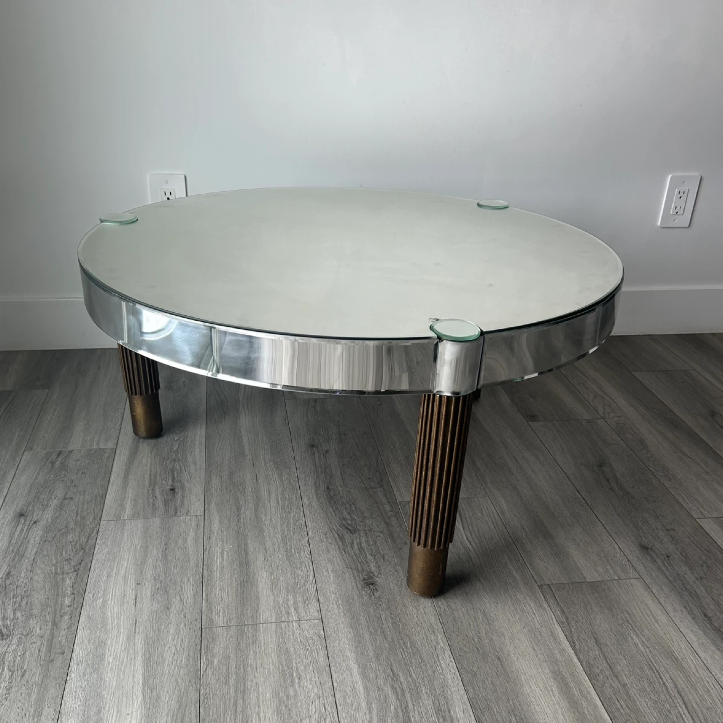 Mirrored Round Coffee Table with Fluted Legs. Glass Top, Polished Rim & Fluted Wooden Legs with Brace Accents. In Good Shape Has Wear As Shown In The Pics.