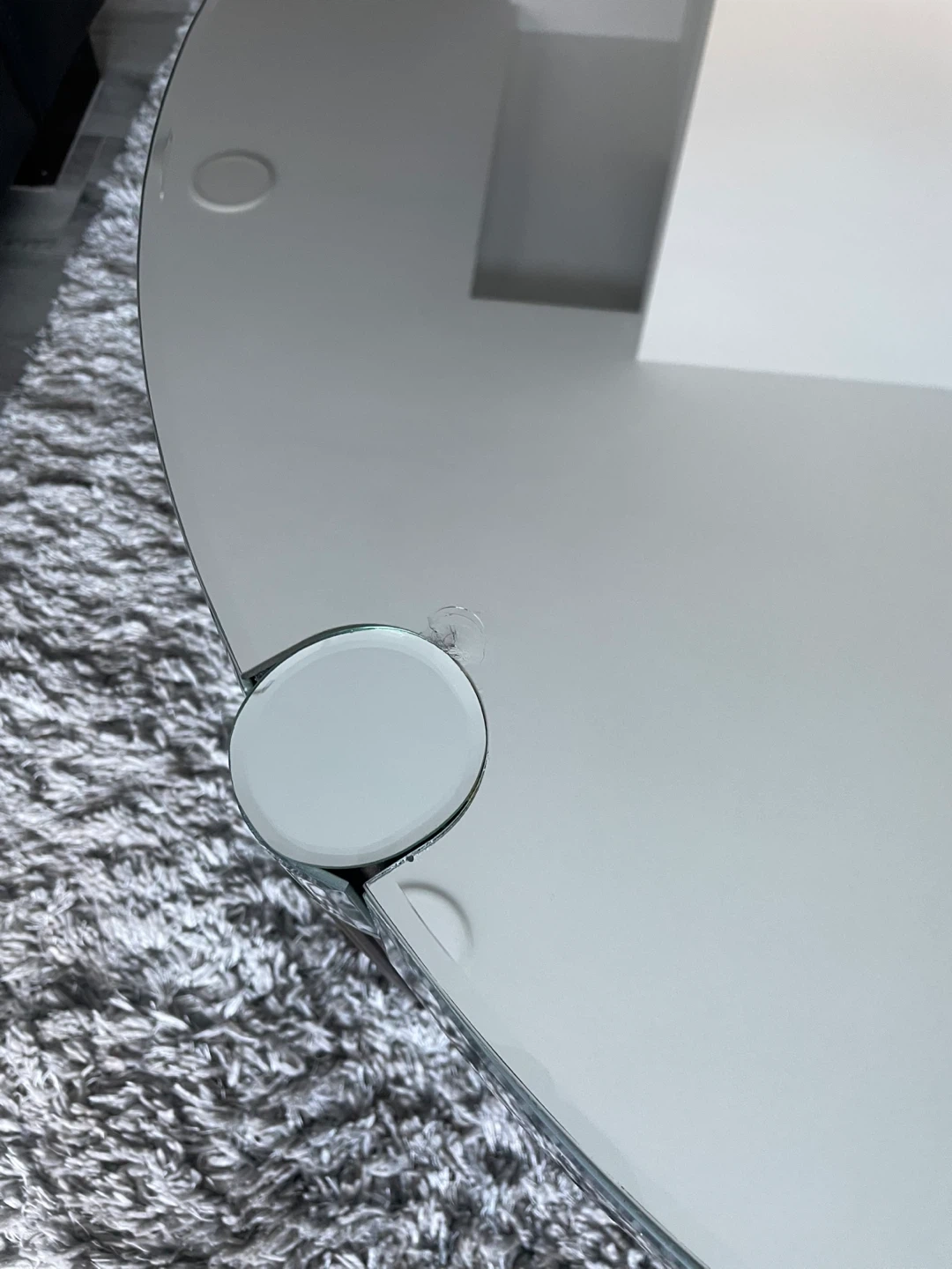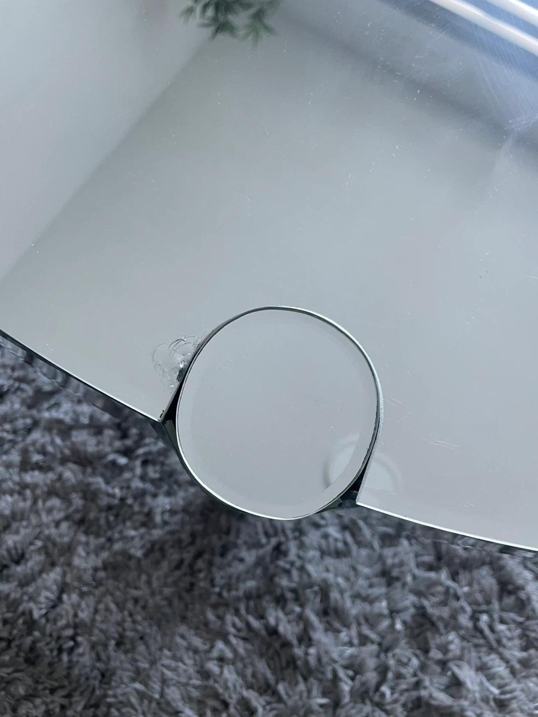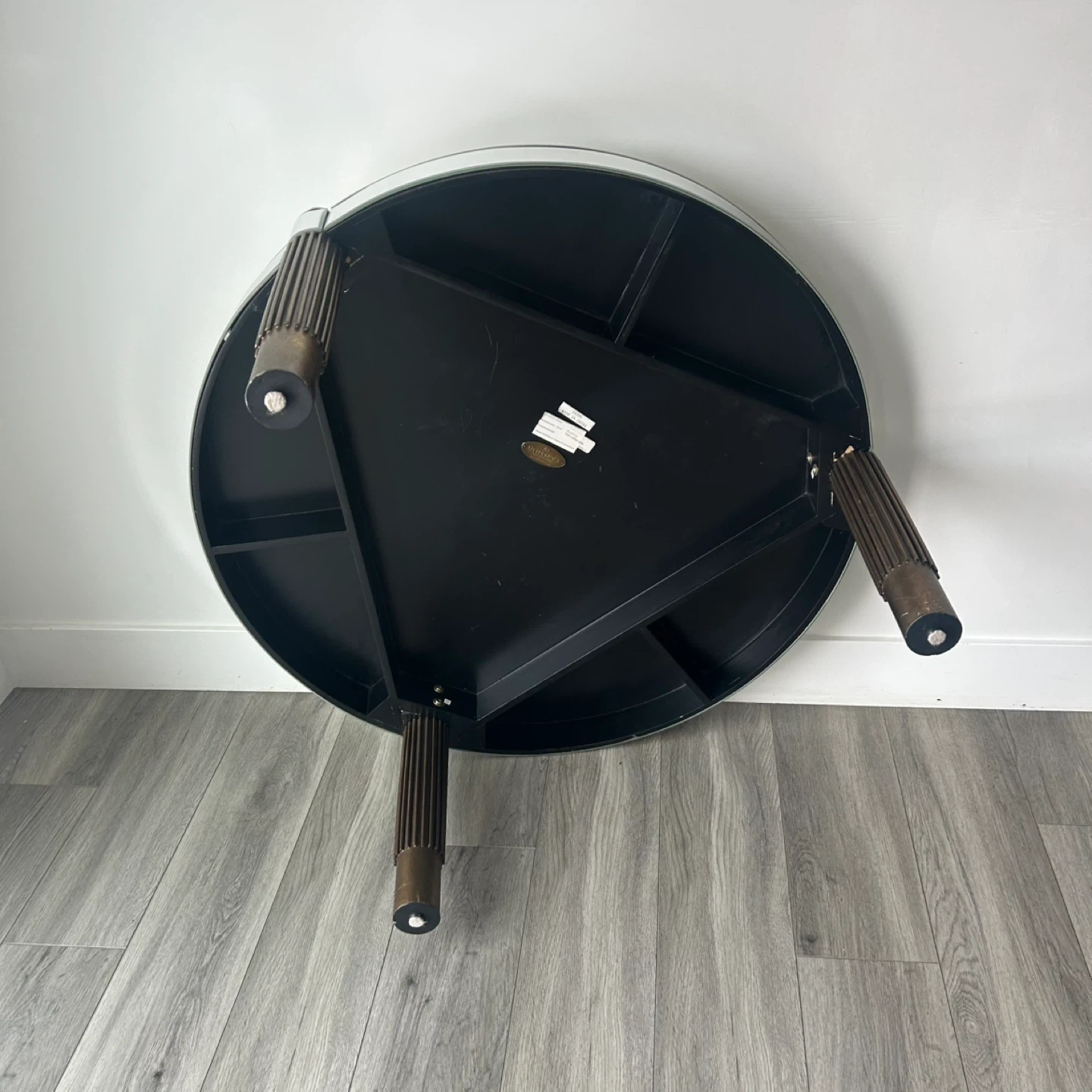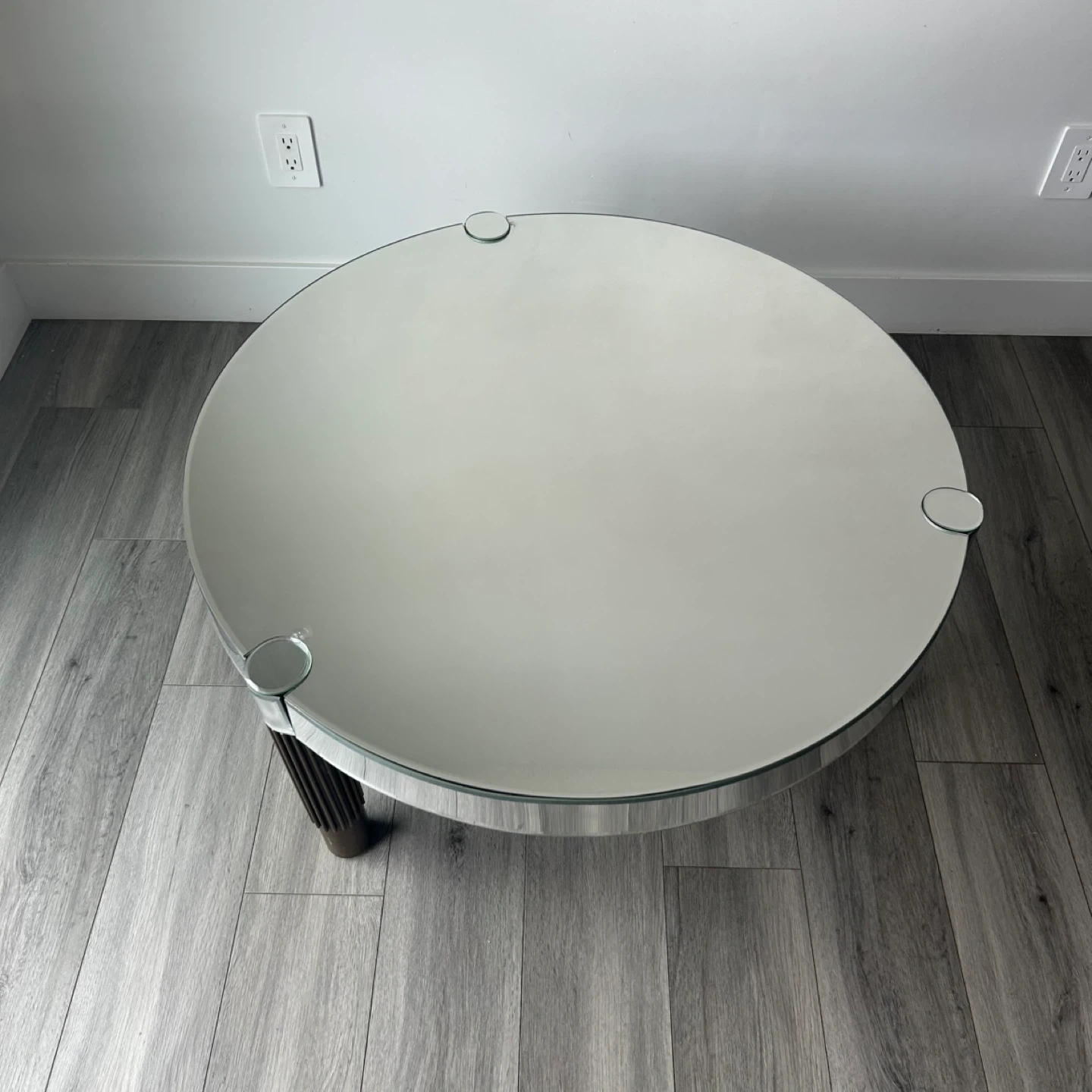 Mirrored Round Coffee Table with Fluted Legs. Glass Top, Polished Rim & Fluted Wooden Legs with Brace Accents. In Good Shape Has Wear As Shown In The Pics.