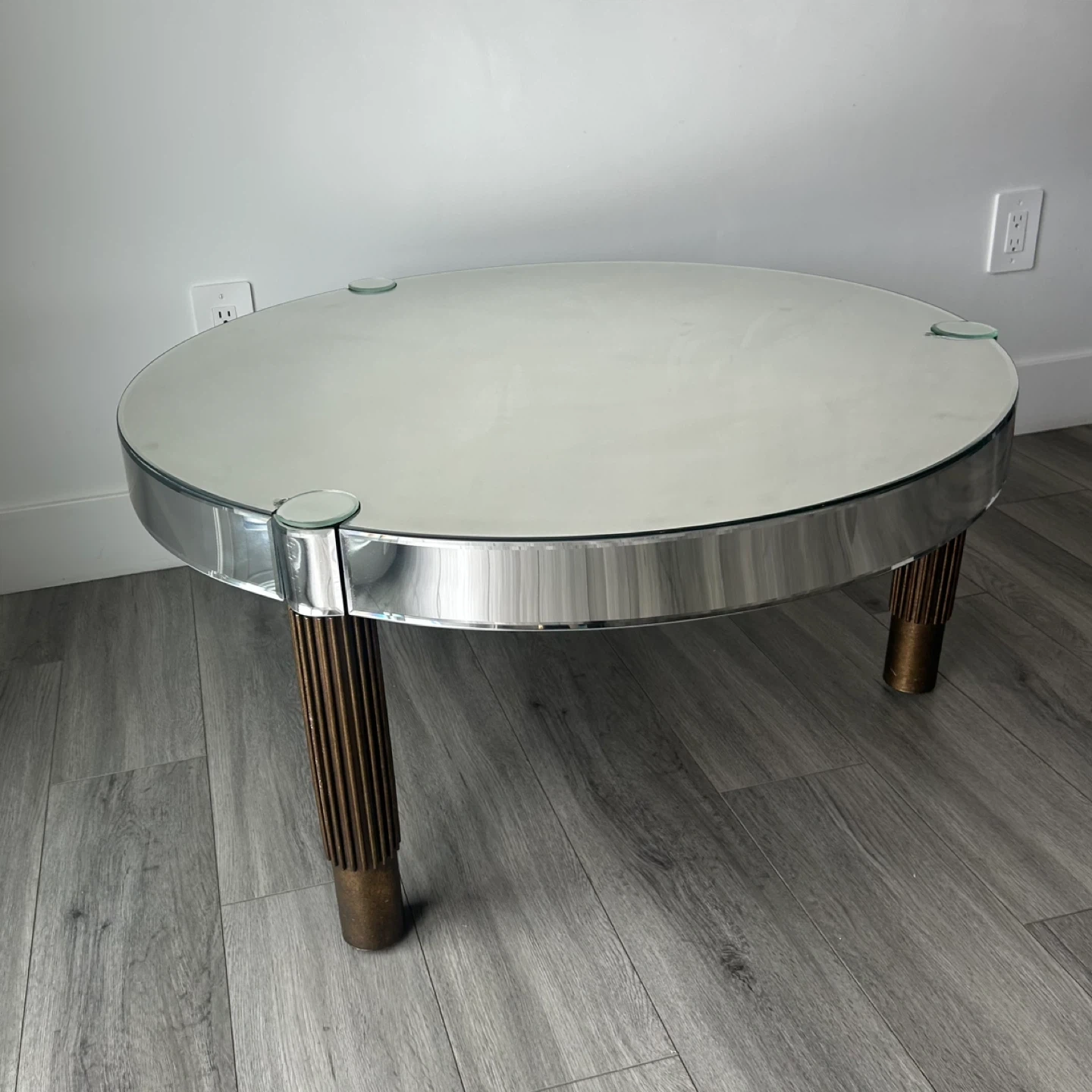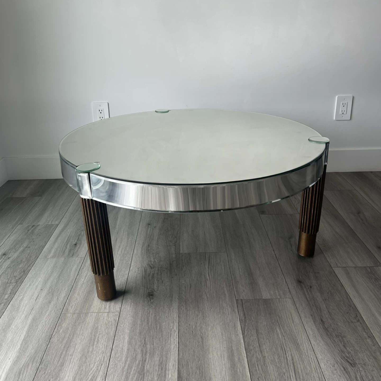 Mirrored Round Coffee Table with Fluted Legs. Glass Top, Polished Rim & Fluted Wooden Legs with Brace Accents. In Good Shape Has Wear As Shown In The Pics.