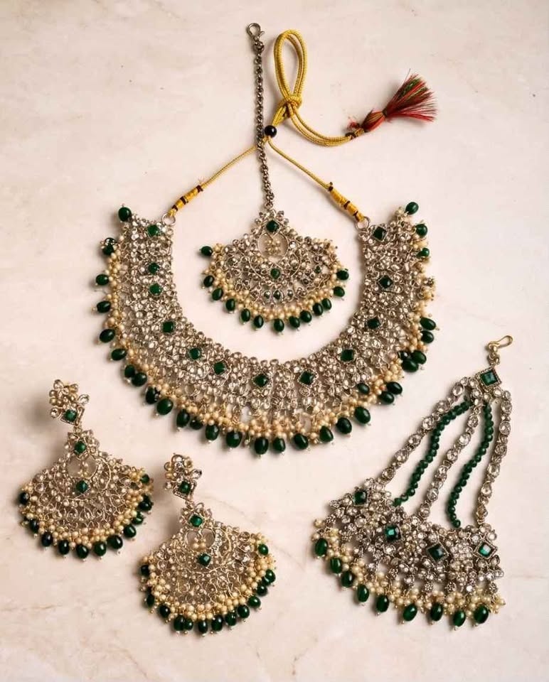 Stunning jewelry set. Includes necklace, earrings, maang tikka, and jhoomar. Has pretty green beads and clear stones. Gold tone metal finish. Complete set for special occasions.