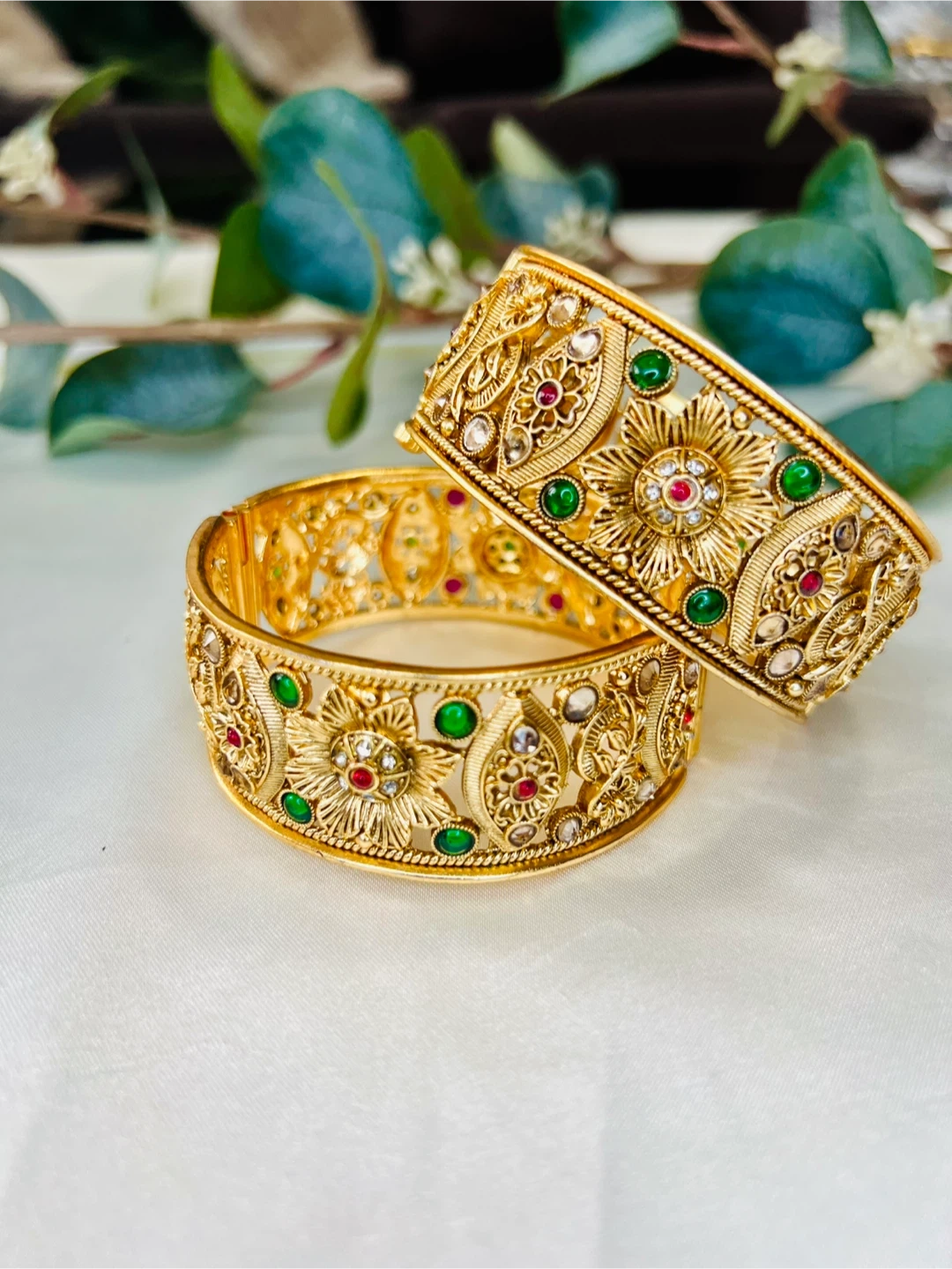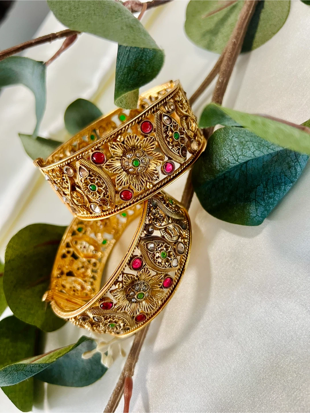 Set of two intricately designed gold-tone bangle bracelets. Each bangle features a detailed floral pattern embellished with small red and green accent stones, along with clear crystals. They're secured with a clasp closure.