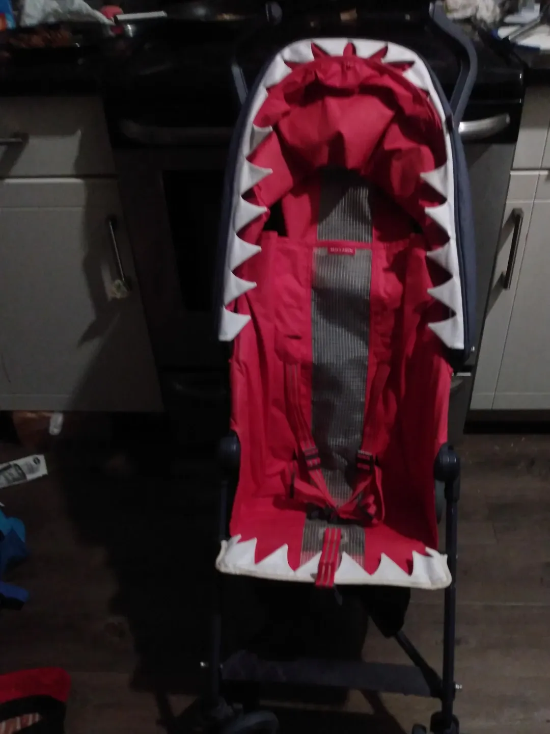 McLaren stroller in a fun red shark design. It's suitable for younger children and features a safety harness. Great for a unique way to get around!