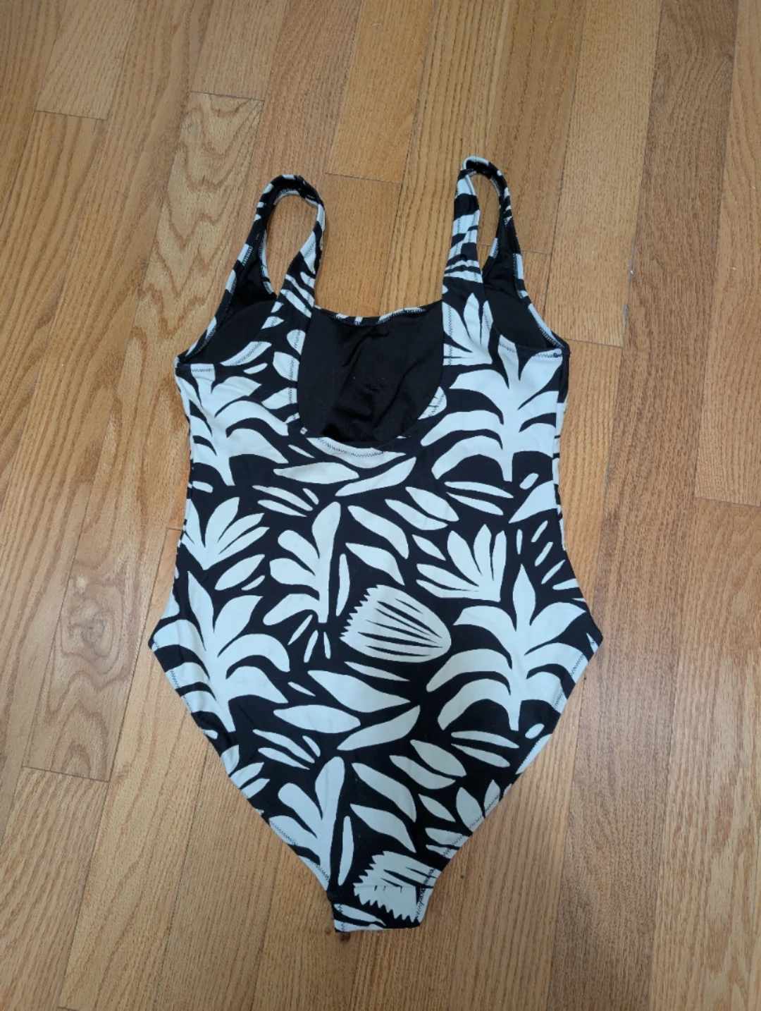 This H&H swimsuit features a bold black and white leaf print. This would be great for a beach day or swimming pool! New, no tags.