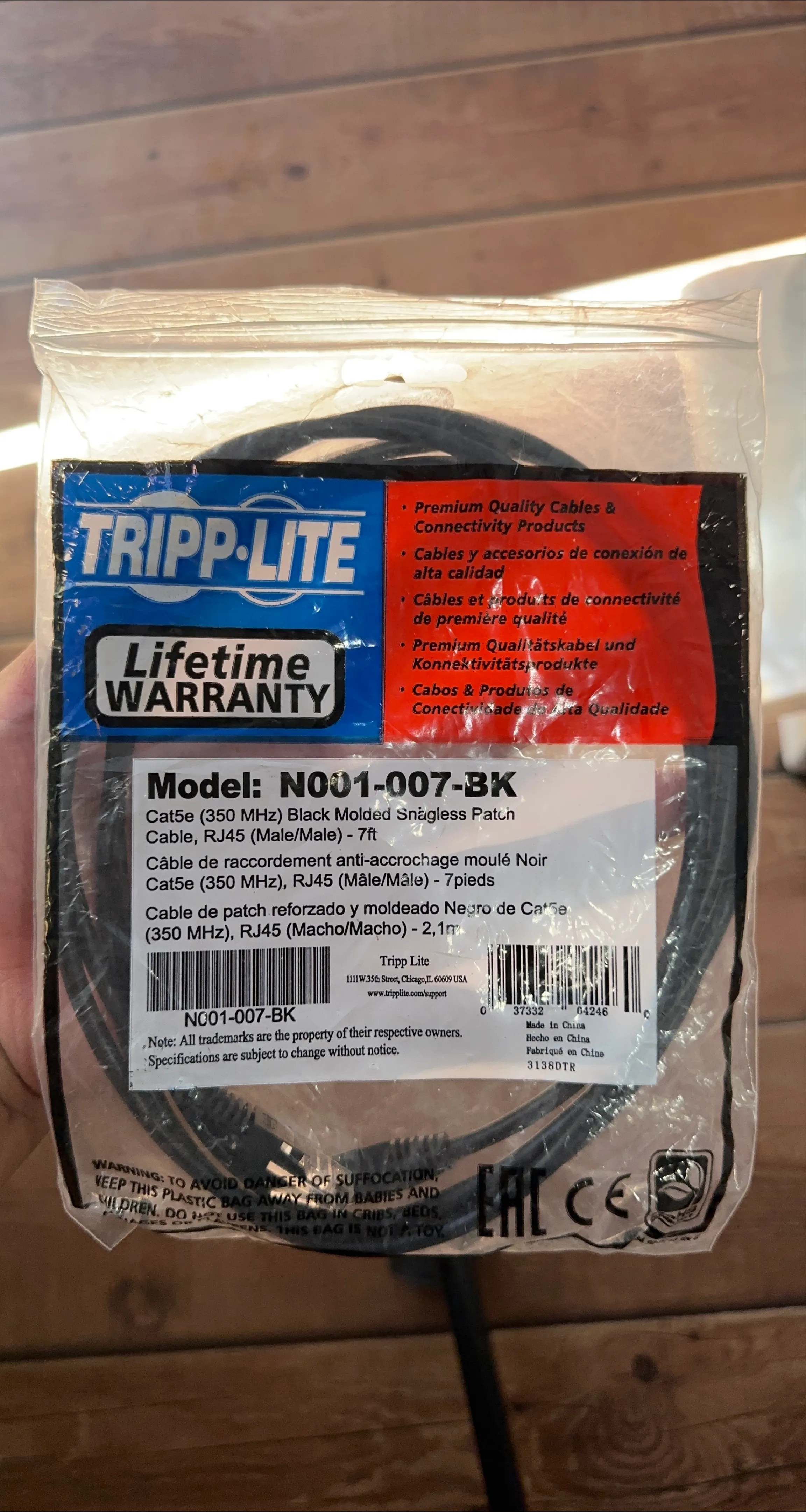 Selling a Tripp Lite Cat5e (350 MHz) Black Molded Snagless Patch Cable, RJ45 (Male/Male). It's 7ft long and brand new in the original packaging! This is model N001-007-BK