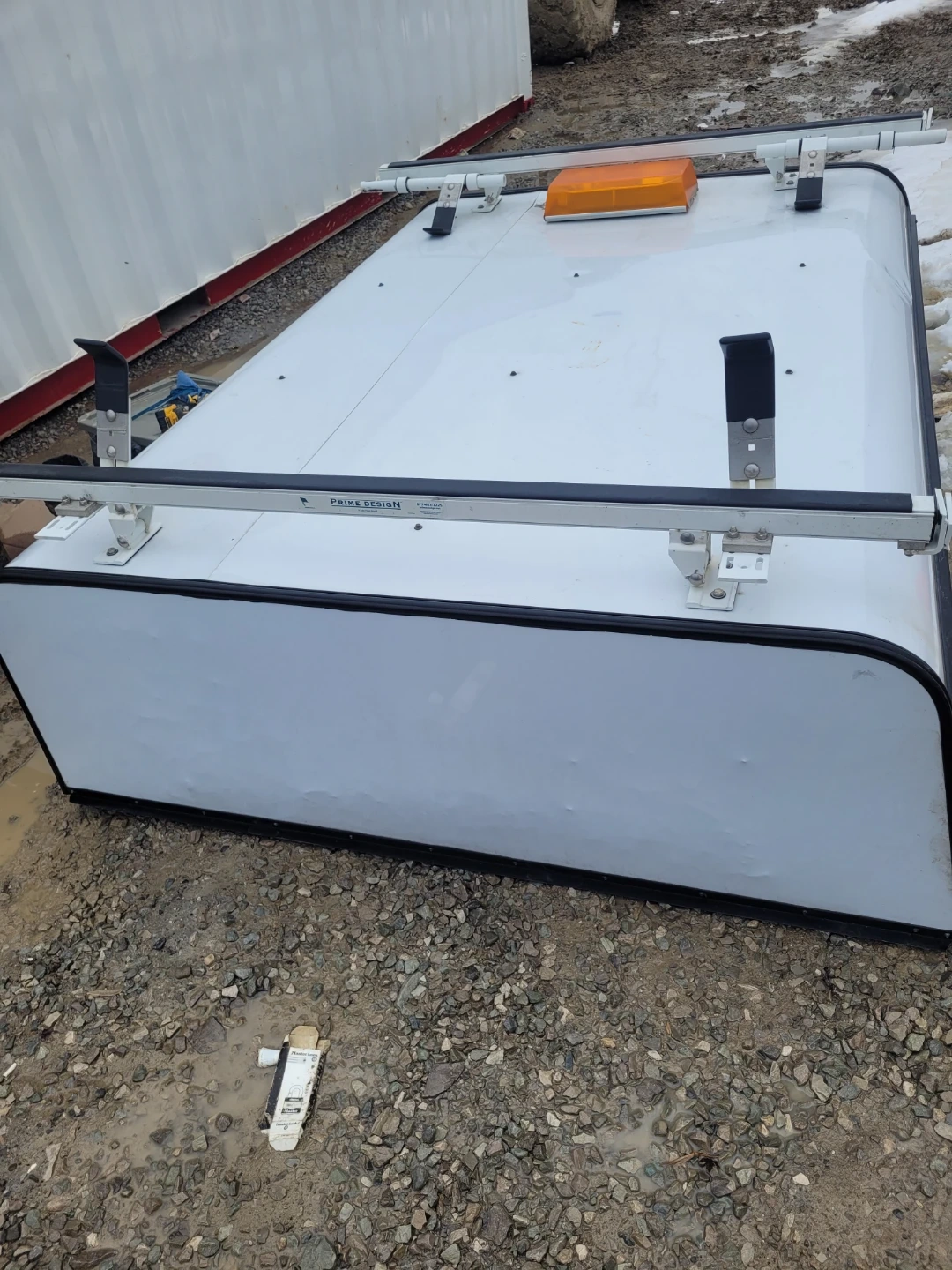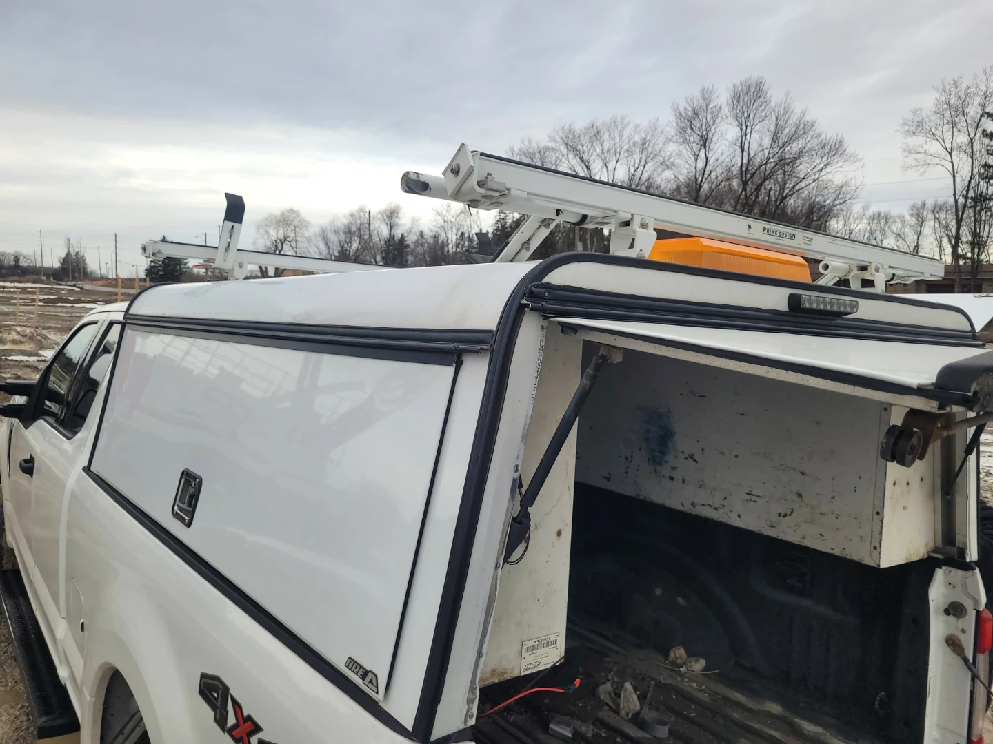 White truck topper with a built-in ladder rack and amber strobe light. Features side access doors and ample storage space inside. It's a durable solution for hauling gear. It's for a 6.75 box, and I did see something today on the tail gate door which would suggest it's for a Ford F250 and 350 only.