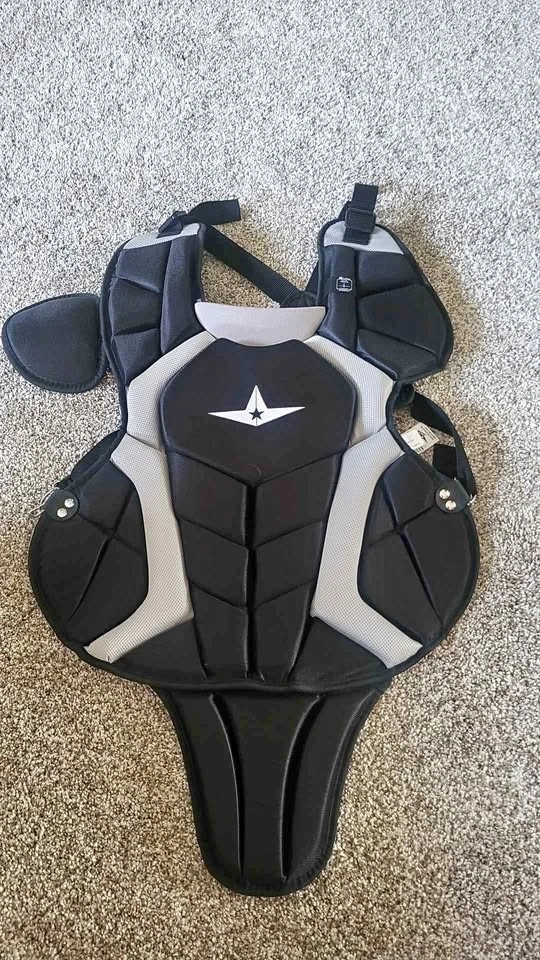 This All-Star Top Star NOCSAE Chest Protector was purchased for softball but wasn't the right fit/size for my pre-teen. It's a size 12-16, or adult Small. Tried on, NEVER used. It's designed for baseball catchers and meets the NOCSAE standard for Commotio Cordis. It offers over-the-shoulder protection and a removable groin protector. The 4-point adjustable harness allows for a customized and secure fit. Made with premium mesh fabric, it's breathable and treated with an antimicrobial agent. It has an adjustable and removable shoulder cap on the right side for unrestricted throwing movement. Chest protectors are measured from the indent between the collarbones to the navel. Feel free to message if you have any questions!