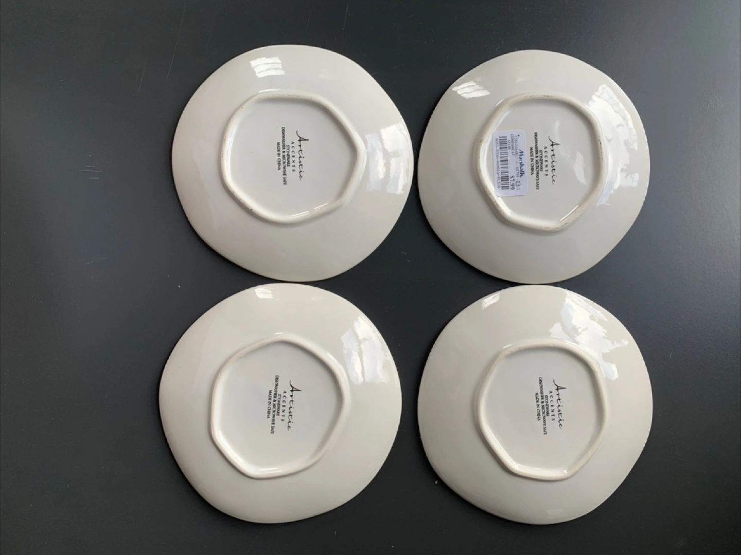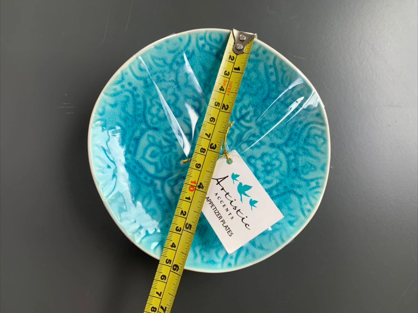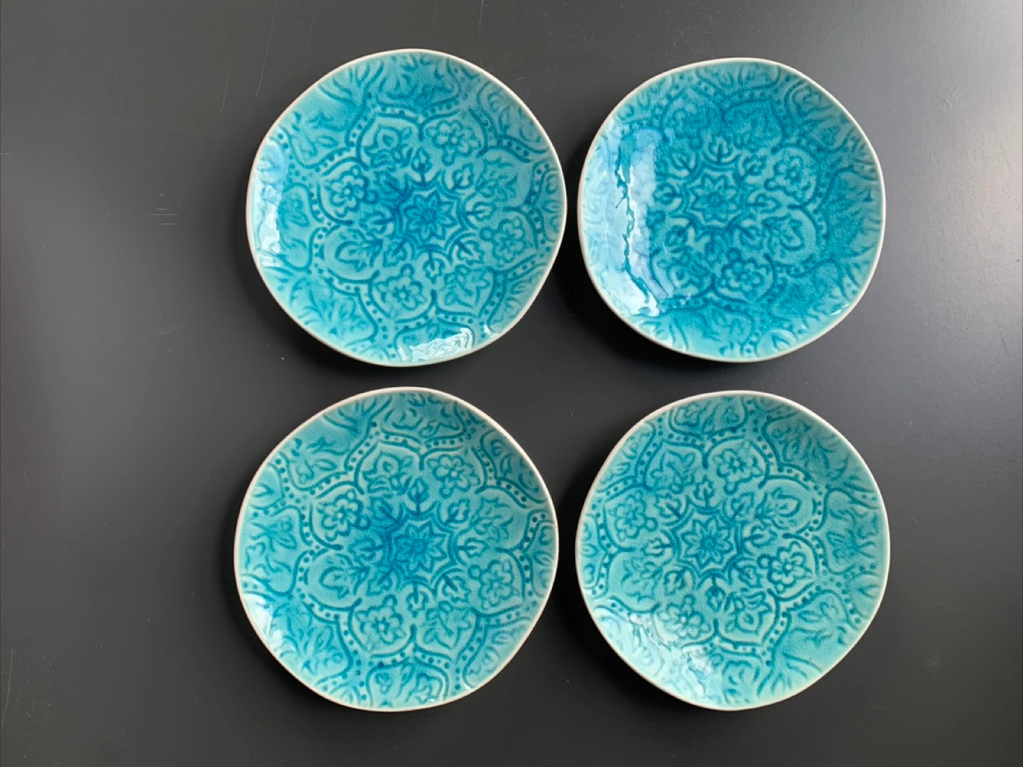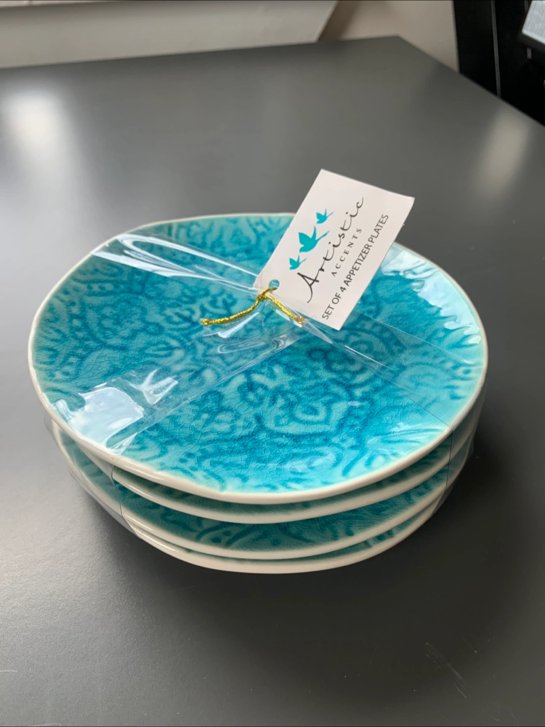 Here's a set of 4 appetizer plates from Artistic Accents. These plates have a beautiful turquoise color and a unique, textured design. Each plate measures approximately 6 inches in diameter.