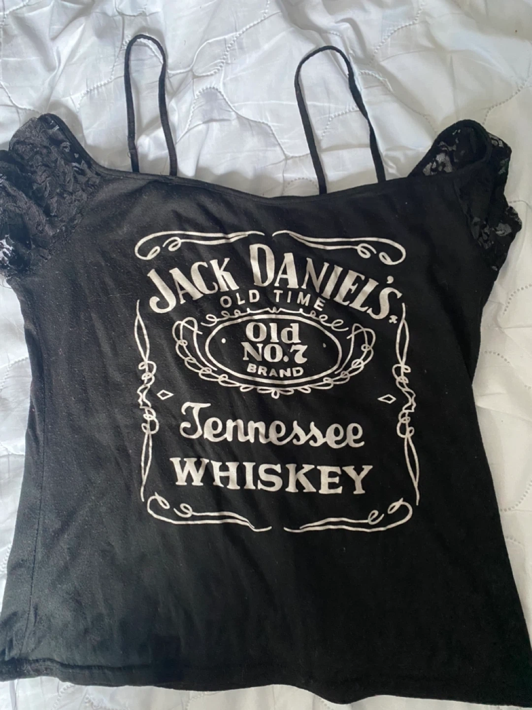 This black t-shirt features the classic Jack Daniel's Old Time Old No. 7 Brand Tennessee Whiskey logo on the front. It has spaghetti straps and lace detailing on the sleeves. Cotton blend material.