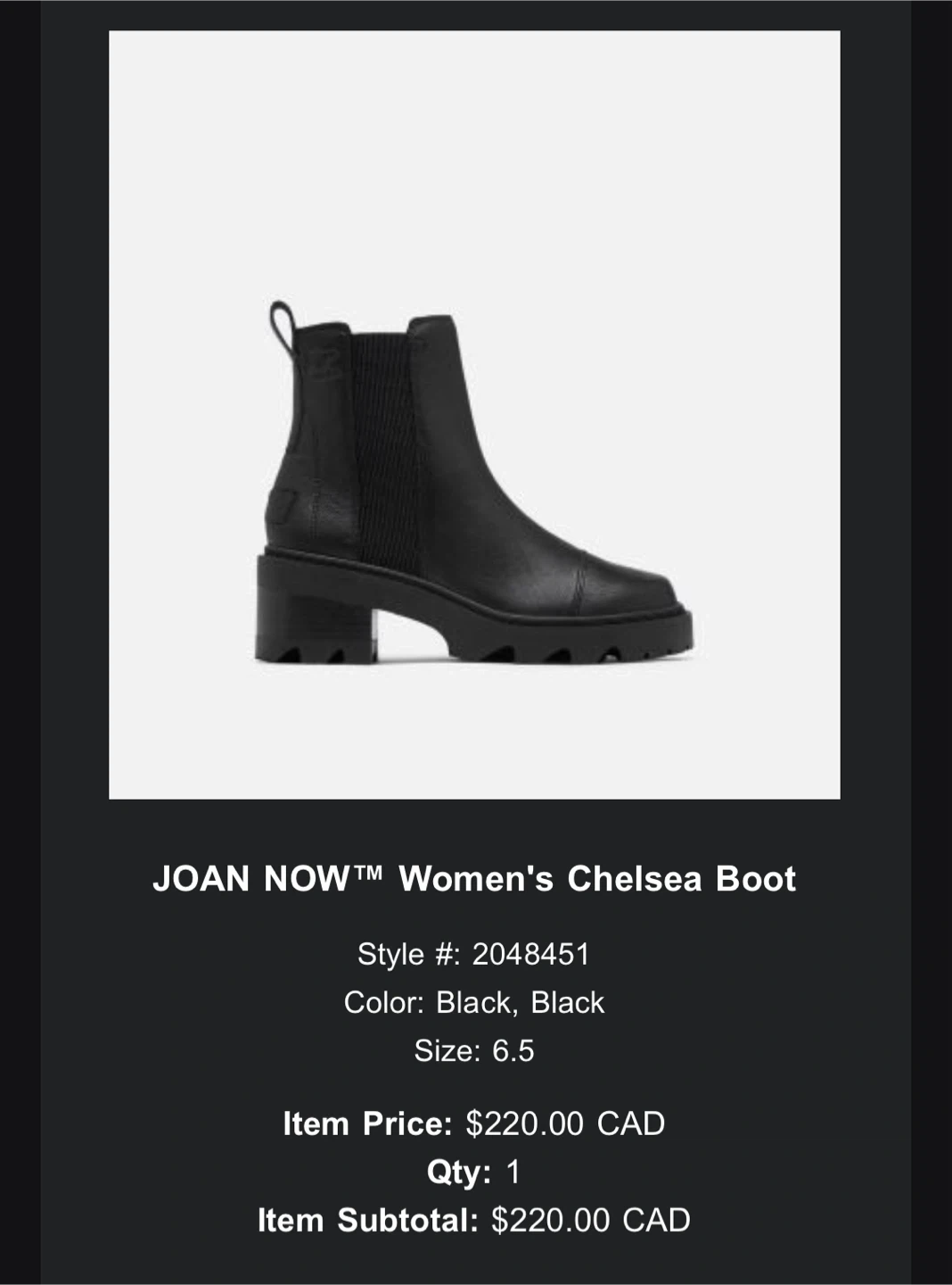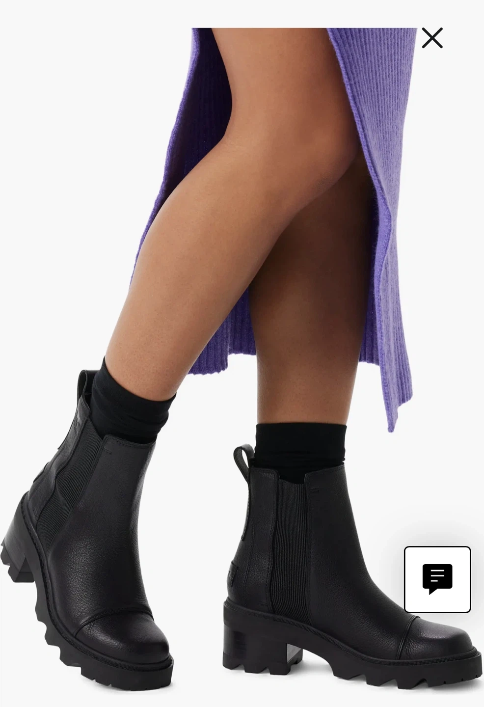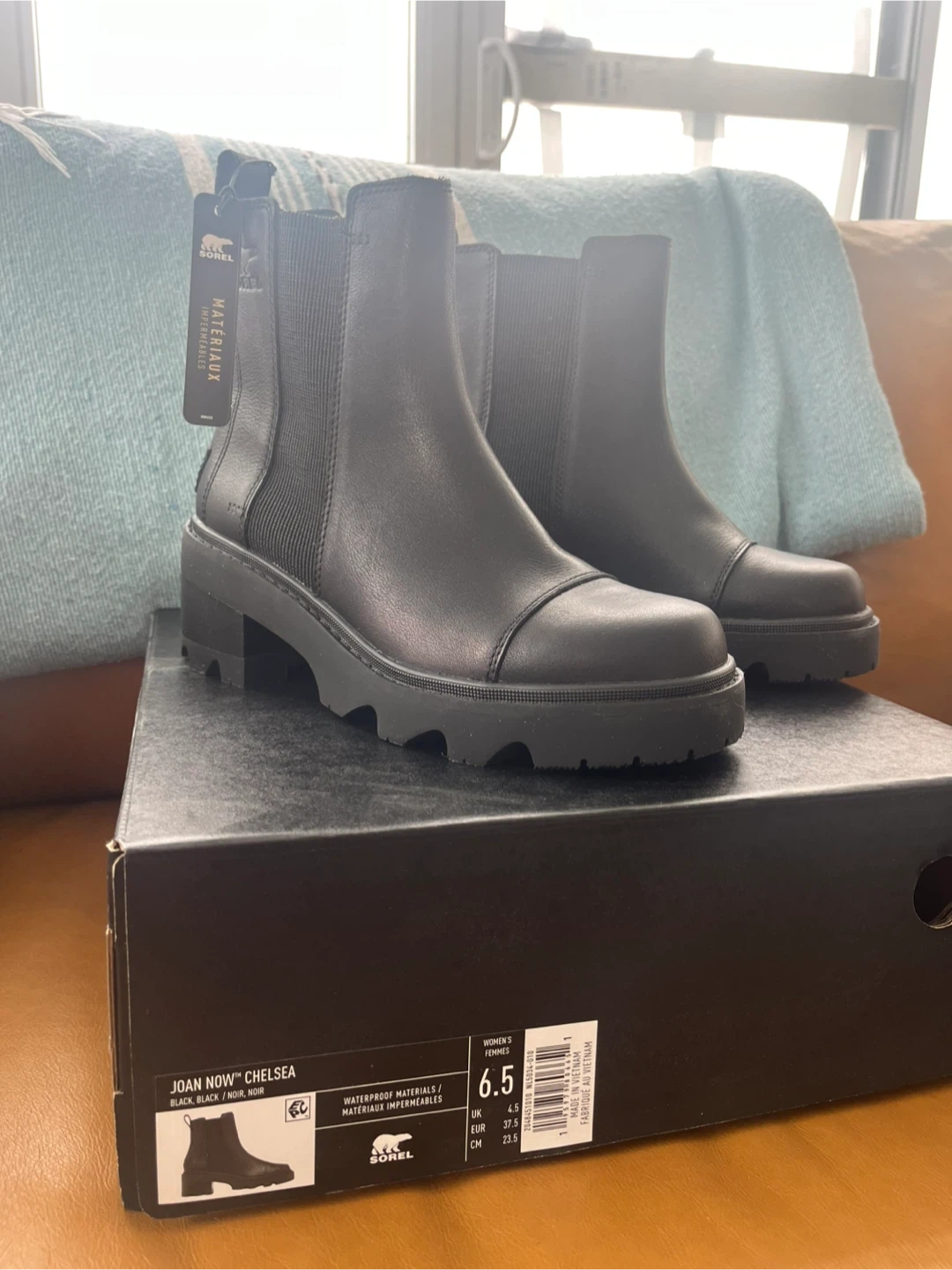 Selling a pair of Sorel Women's Chelsea Boots in black, size 6.5. These stylish boots feature a chunky heel and waterproof materials, perfect for Canadian weather! They originally retailed for $220. Never worn, comes with the original box!