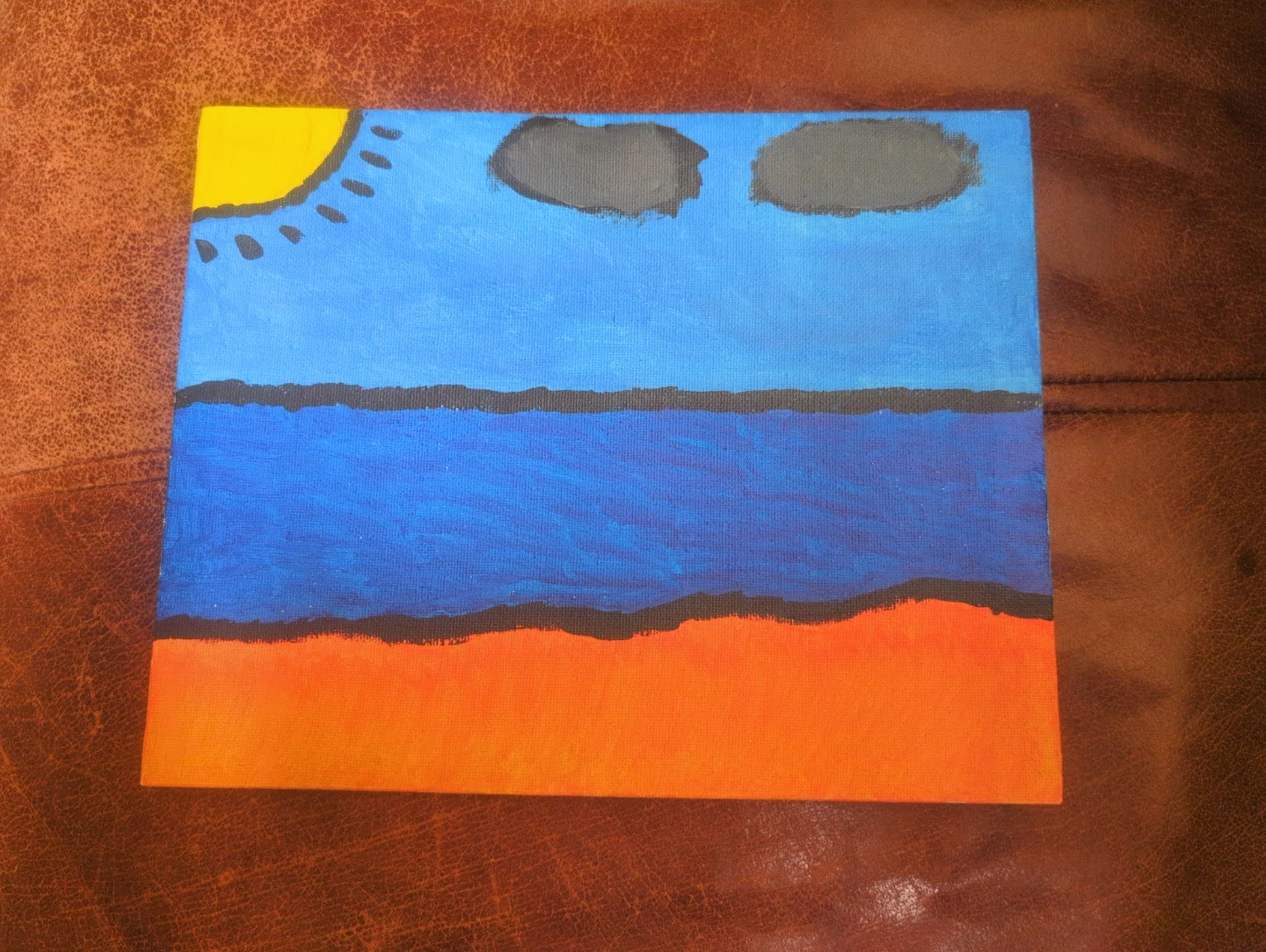 Original acrylic painting on canvas. It depicts a sunny day at the beach with clouds over the ocean. Canvas size is approximately 8x10 inches.