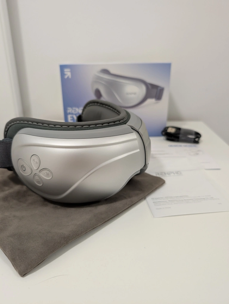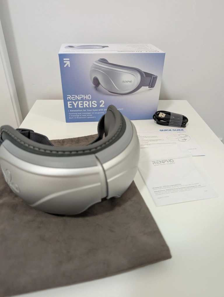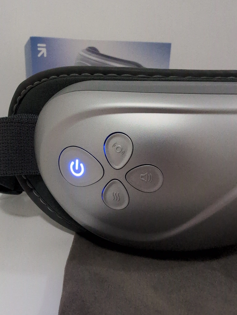 Relaxing eye massager with 2 massage & heat levels. Has Bluetooth so you can play your own music. Comes with original accessories - USB charging cable and carrying pouch.