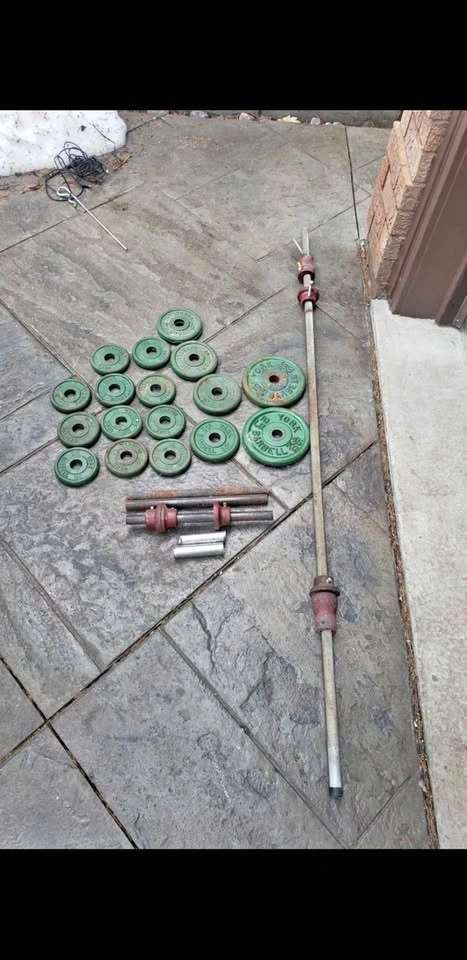 Rusty York Barbell weight set. Includes a long barbell, two shorter dumbbell bars, and a variety of green weight plates. Plates include 10 LB, 5 LB, and 2.5 KG. Great for a home gym setup.