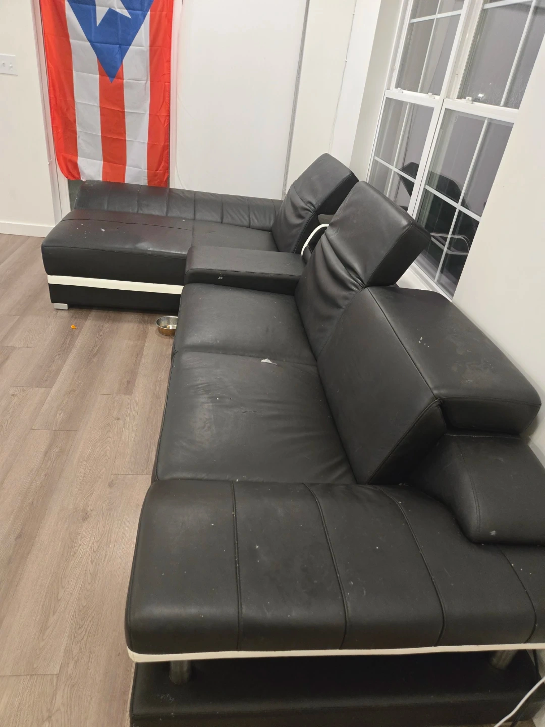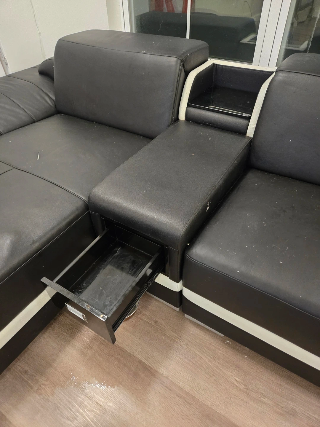 This black faux leather sectional sofa offers a modern design. It features a pull-out storage drawer in one armrest and a small shelf. This is a section of a $4,000 couch, and the other section is posted on my account.