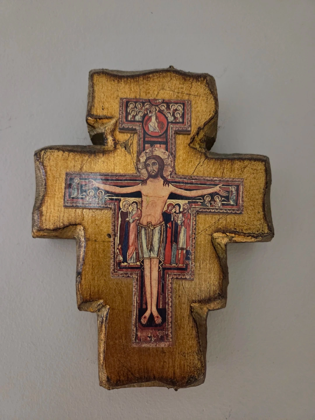 Vintage-style wooden cross with beautiful religious icon artwork.