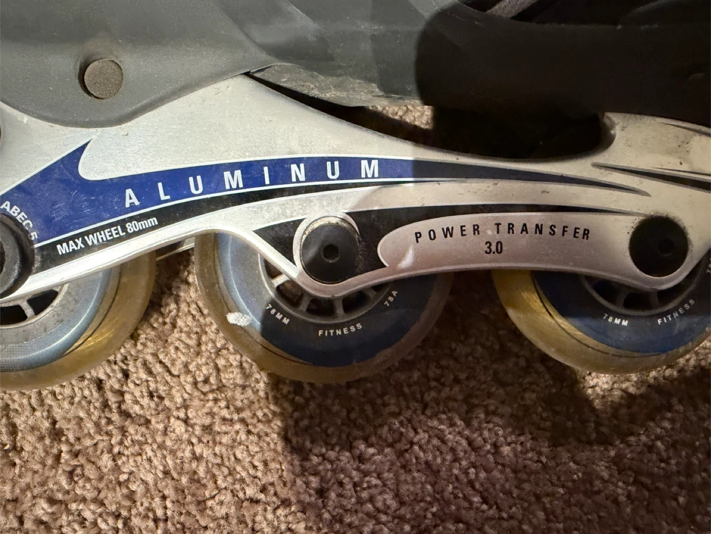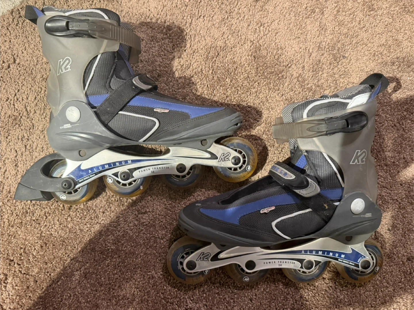 These K2 inline skates are designed for power transfer. They feature aluminum frames and 80mm max wheels. The skates are blue and grey.