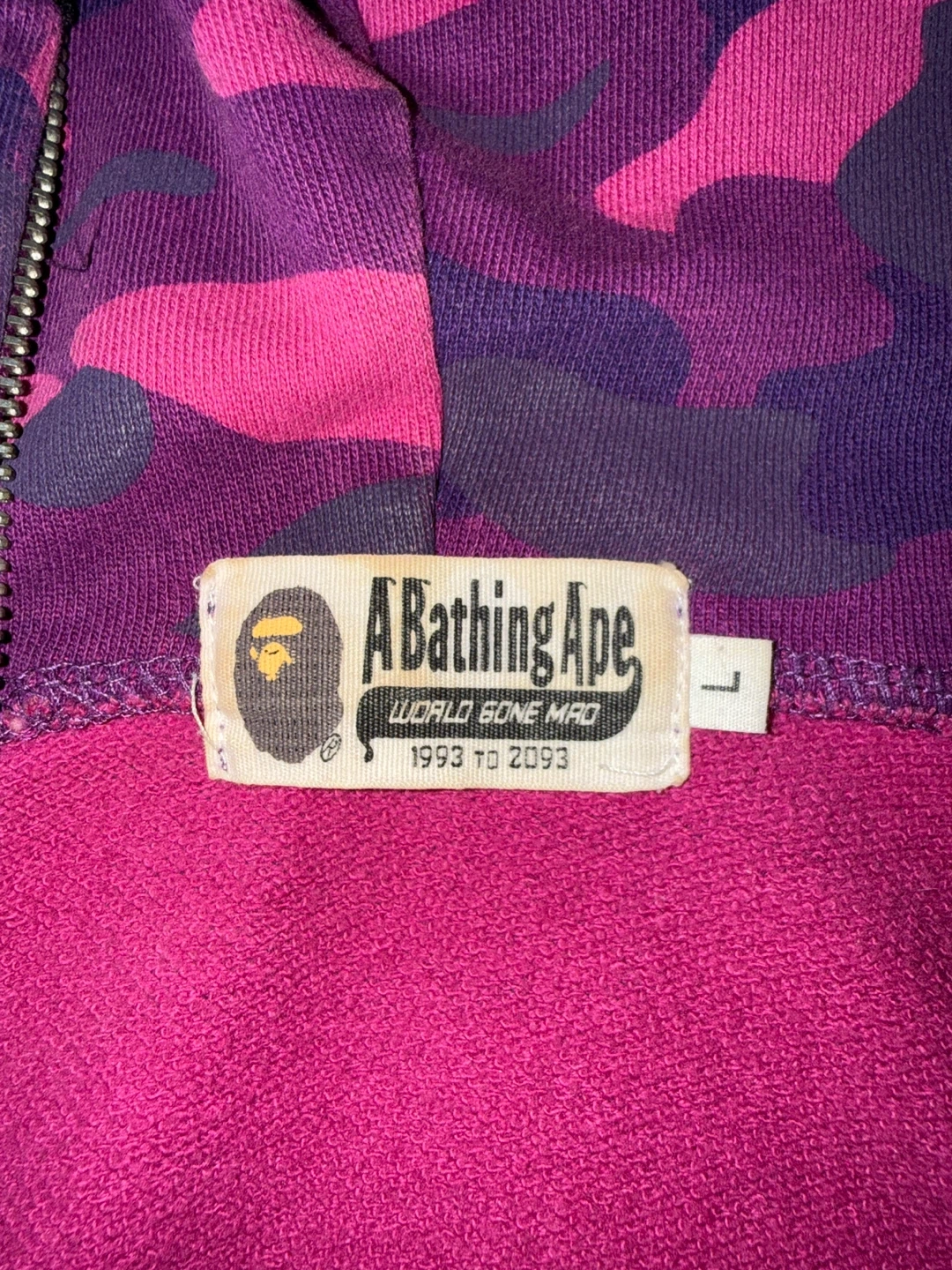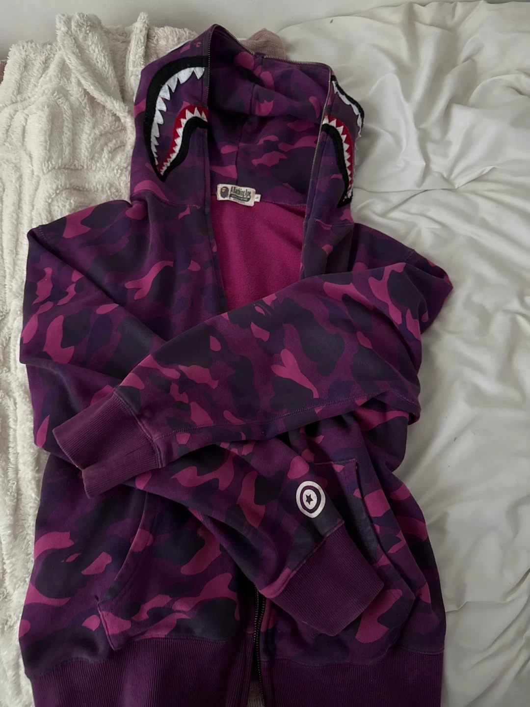 Selling an A Bathing Ape (BAPE) purple camo shark hoodie in size L. It's in great condition beside the fact that the zipper is broken due to wear, but is easily fixable at any store.