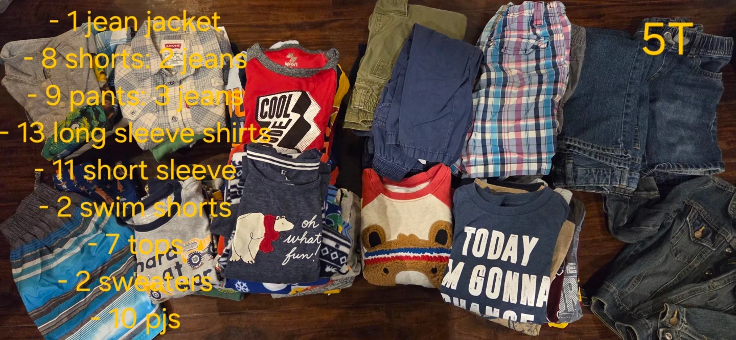 A bundle of boys' clothing in size 5T. Includes 1 jean jacket, 8 shorts, 9 pants, 13 long sleeve shirts, 11 short sleeve shirts, 2 swim shorts, 7 tops, 2 sweaters, and 10 pairs of pyjamas. One Levi's jean jacket is included.