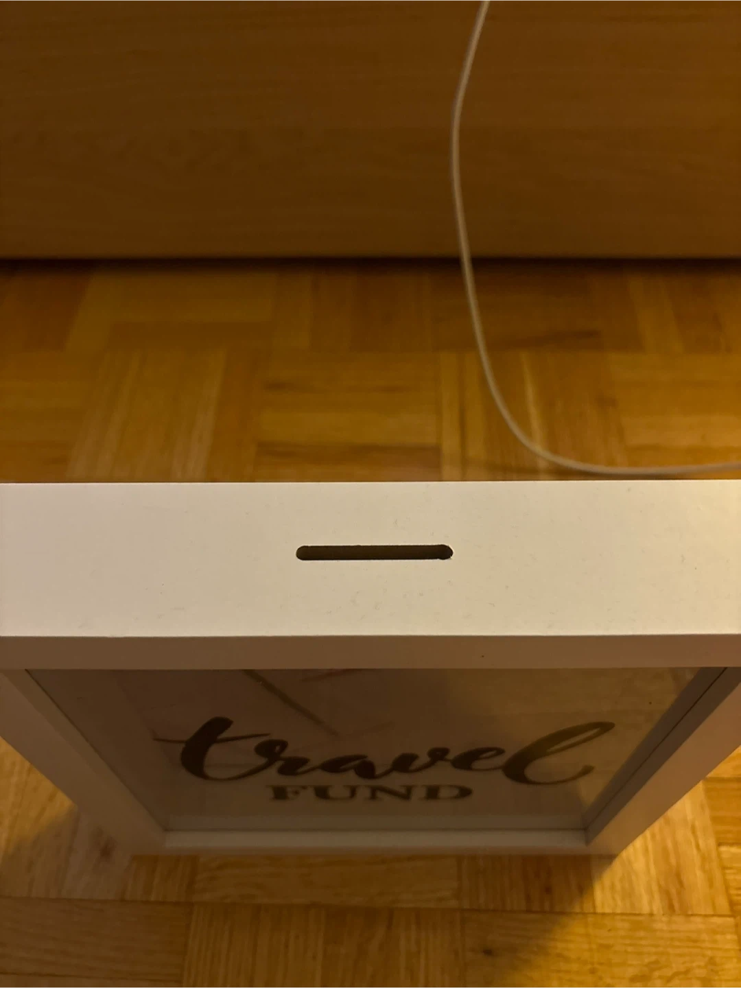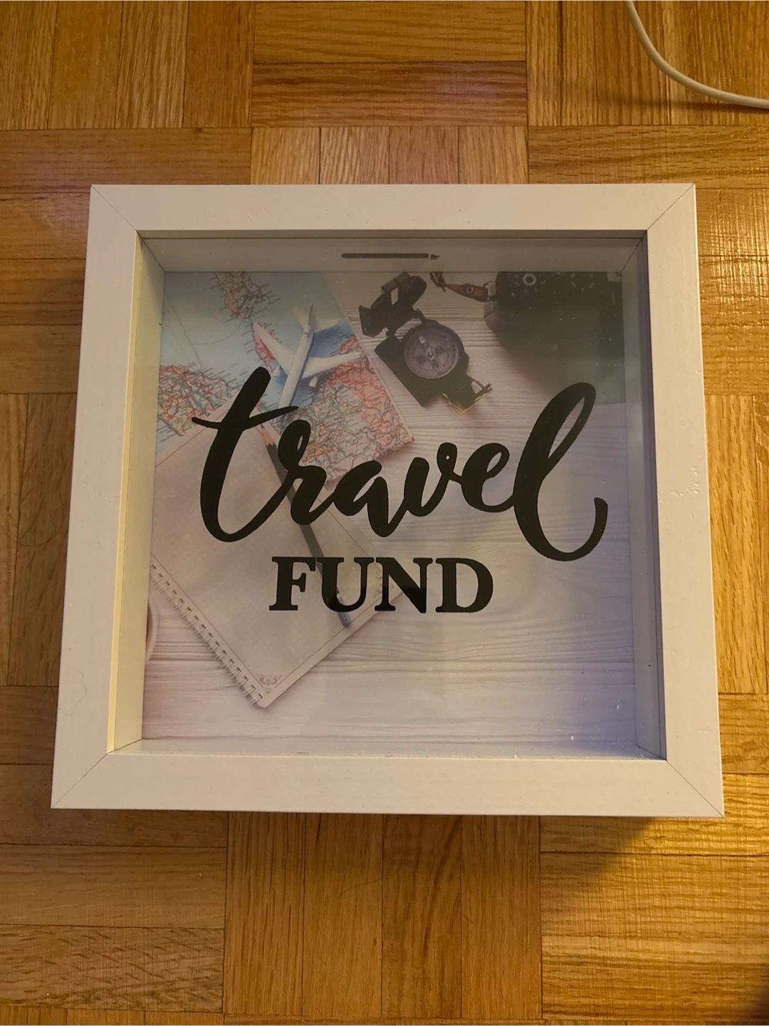 This white shadow box is designed as a coin bank for your travel fund. It features a slot on top for inserting coins and bills. The front displays a graphic with the words 'Travel Fund' and travel-themed imagery.