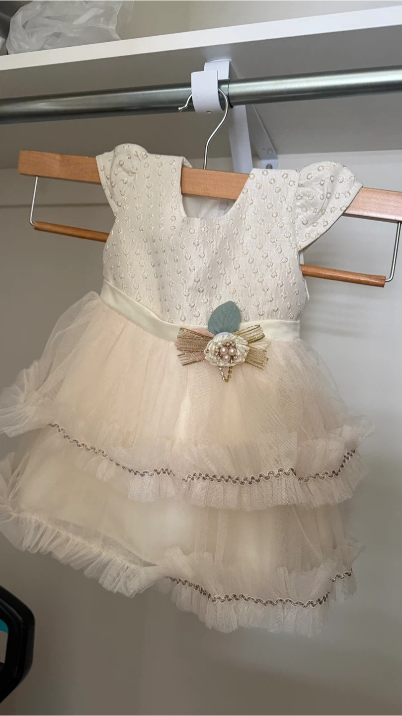 Cream-coloured baby dress with a textured bodice and a layered tulle skirt. It features a decorative bow with pearls and a leaf accent at the waist. This dress is perfect for special occasions or photos!