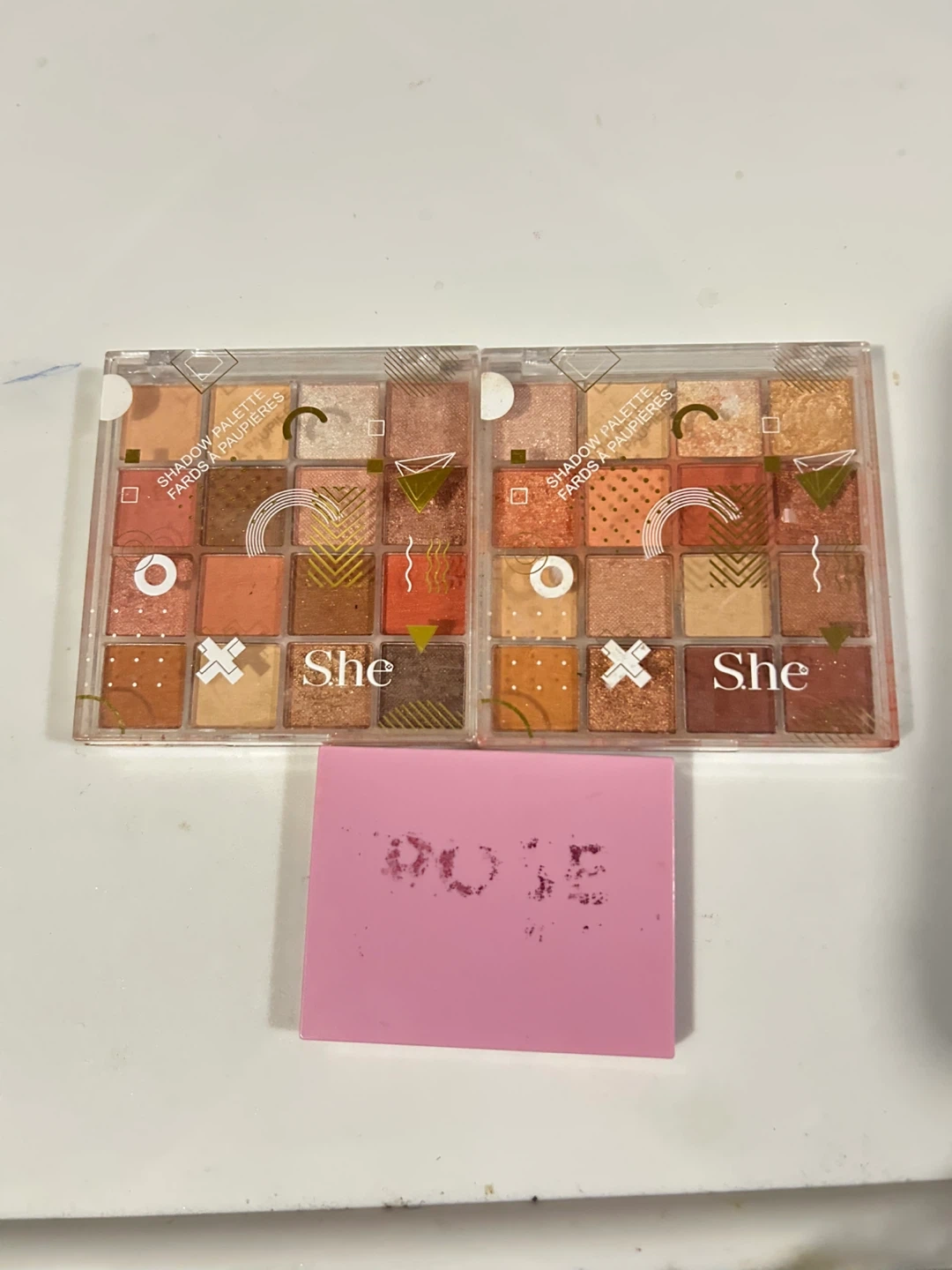 Selling two eyeshadow palettes from She. Most of colors are not used. One palette has 6 colours, and the other has 16 colours! The palette with 6 colours is pink, and the palette with 16 colours has a clear case. The original price for one palette was $9.90. Pink palette has one broken shade.