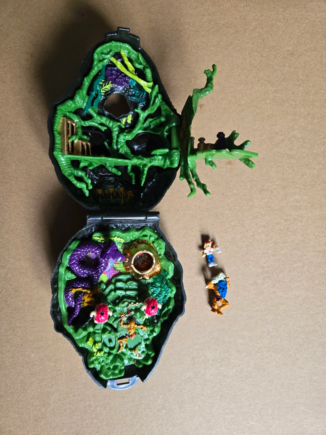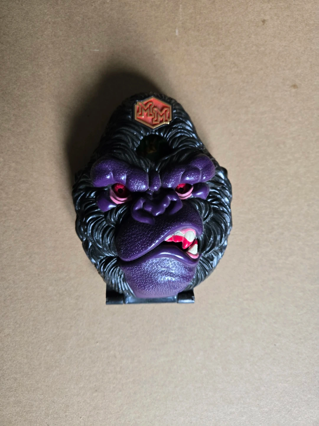 This is a Mighty Max Kong's Volcano playset. It comes with two small figures and features a pop-open design. The playset has intricate details for imaginative play. Missing peices.