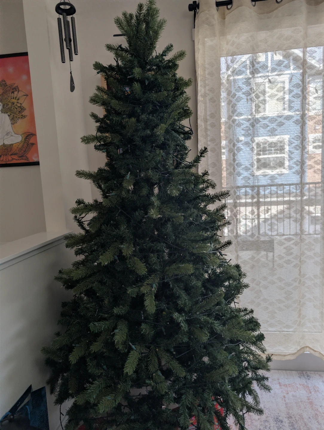 It's a green artificial Christmas tree with lights already on it. This tree is perfect for setting up holiday cheer in your home.