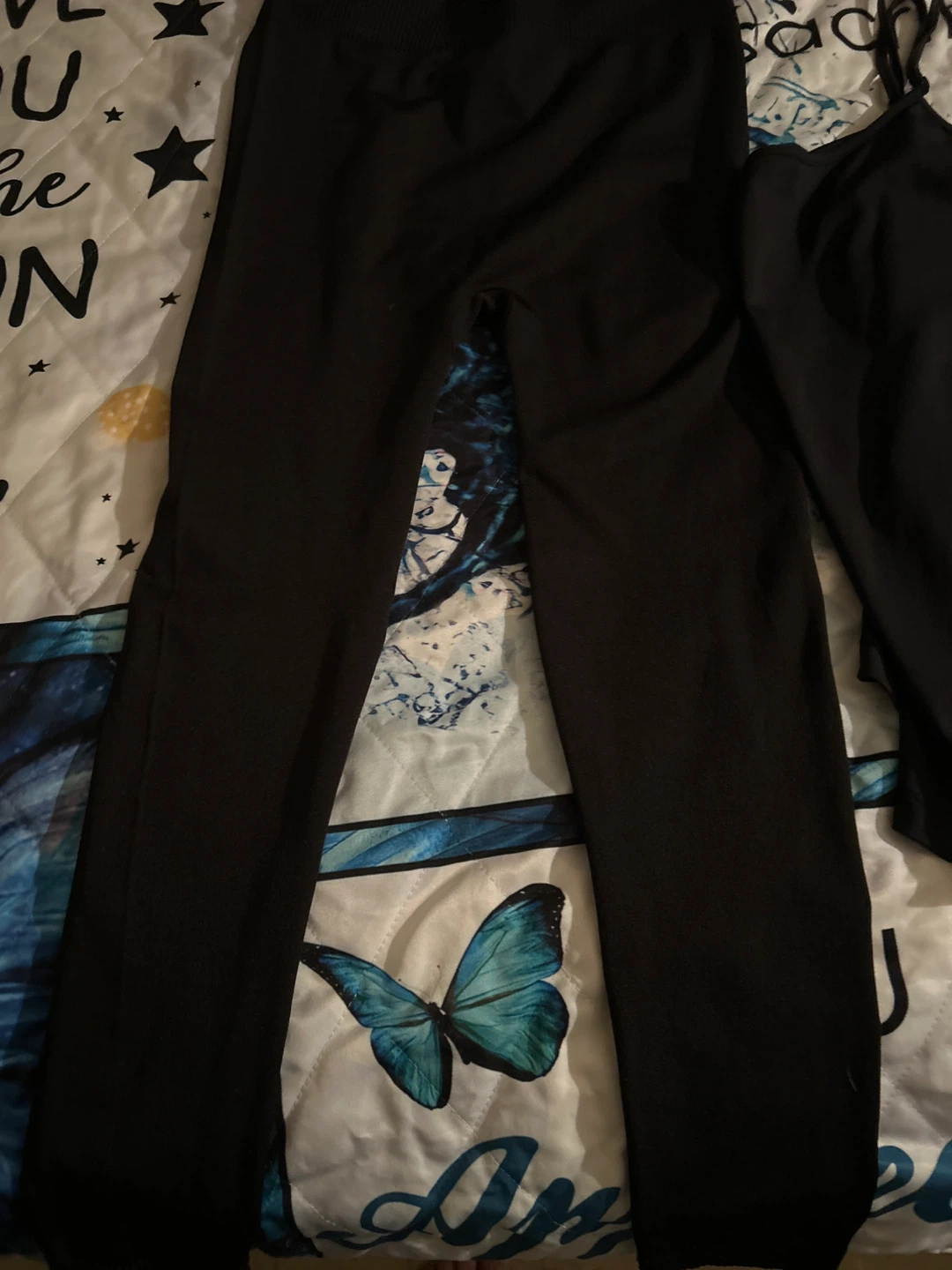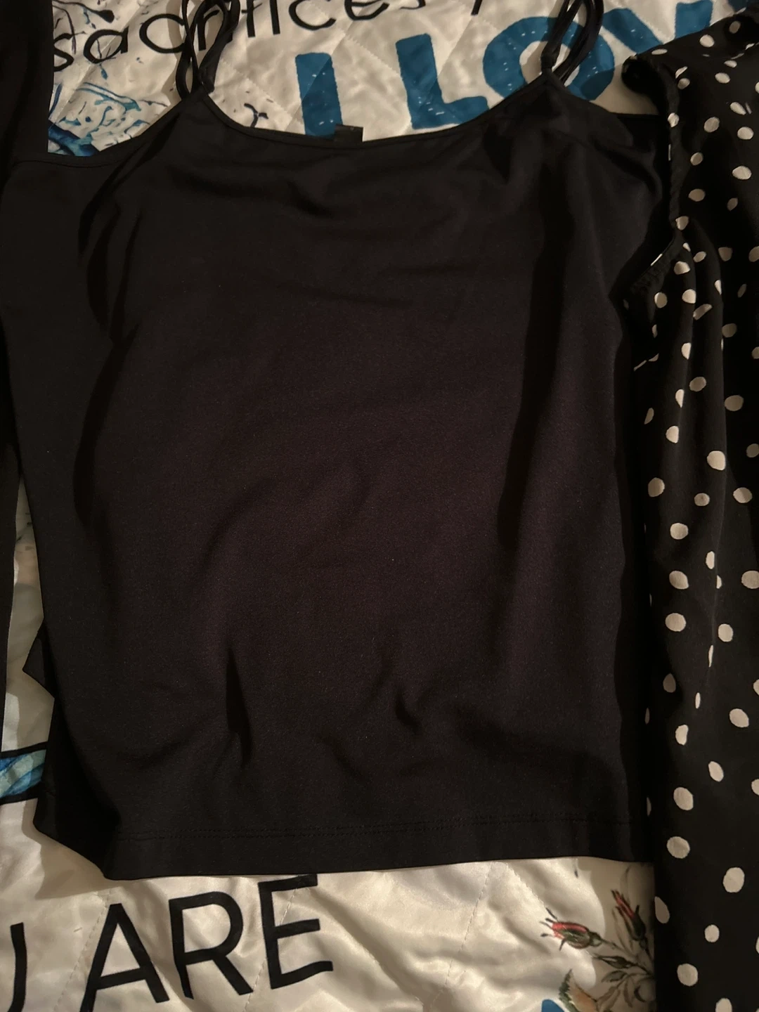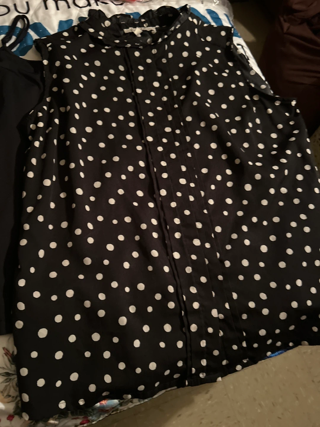 Sleeveless black top with white polka dots and a ruffled collar. It's a size medium and made of lightweight fabric. This top's classic design makes it easy to dress up or down!