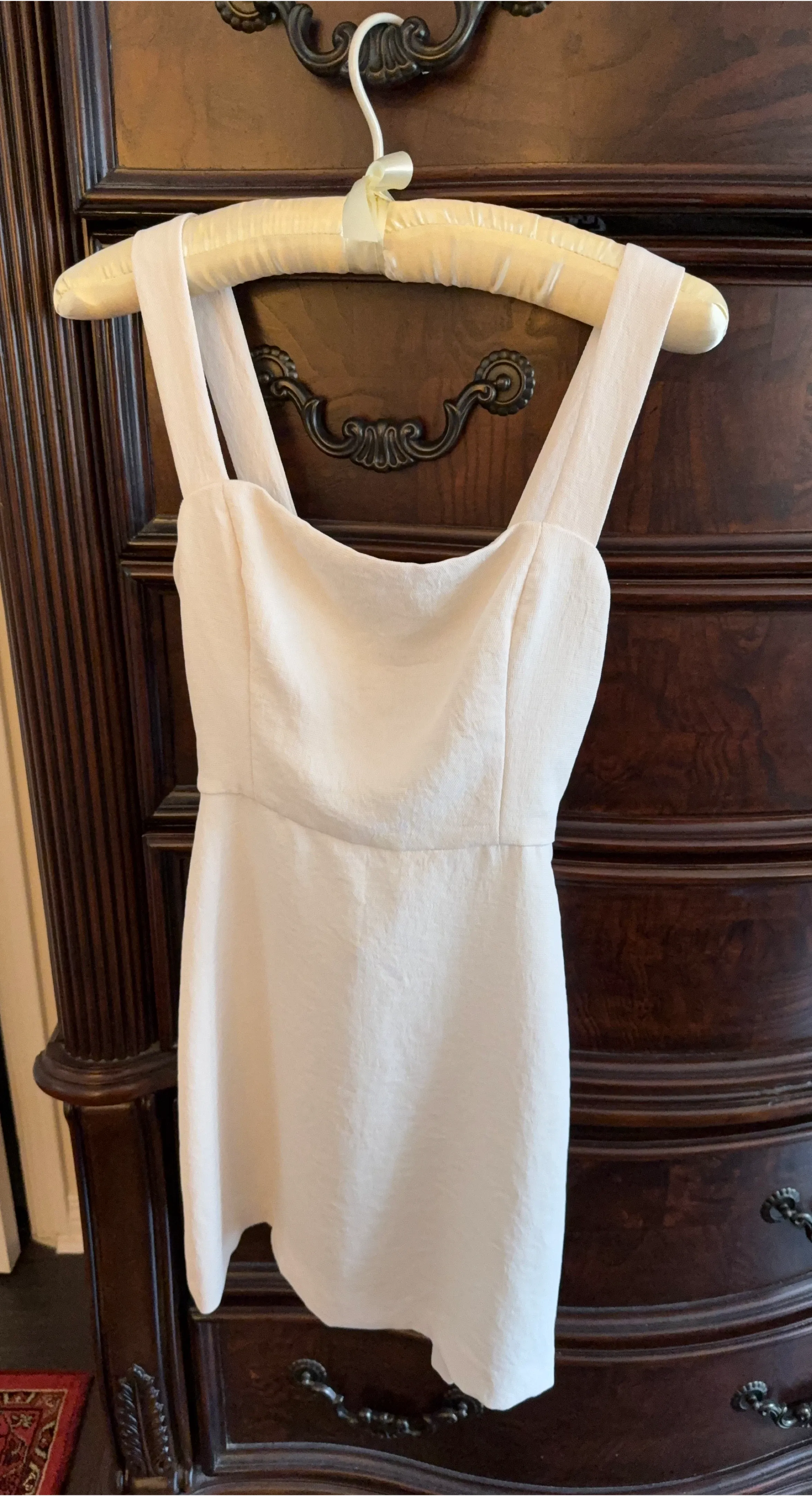 Lightweight cream dress with a flattering square neckline. It's a mini length with tank-style straps. This dress is great for warmer weather or layering!:)