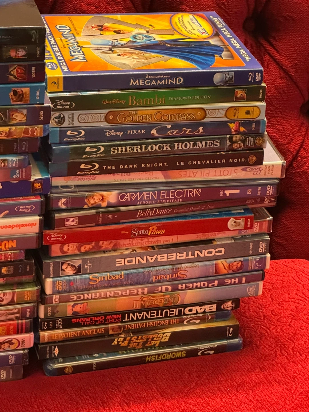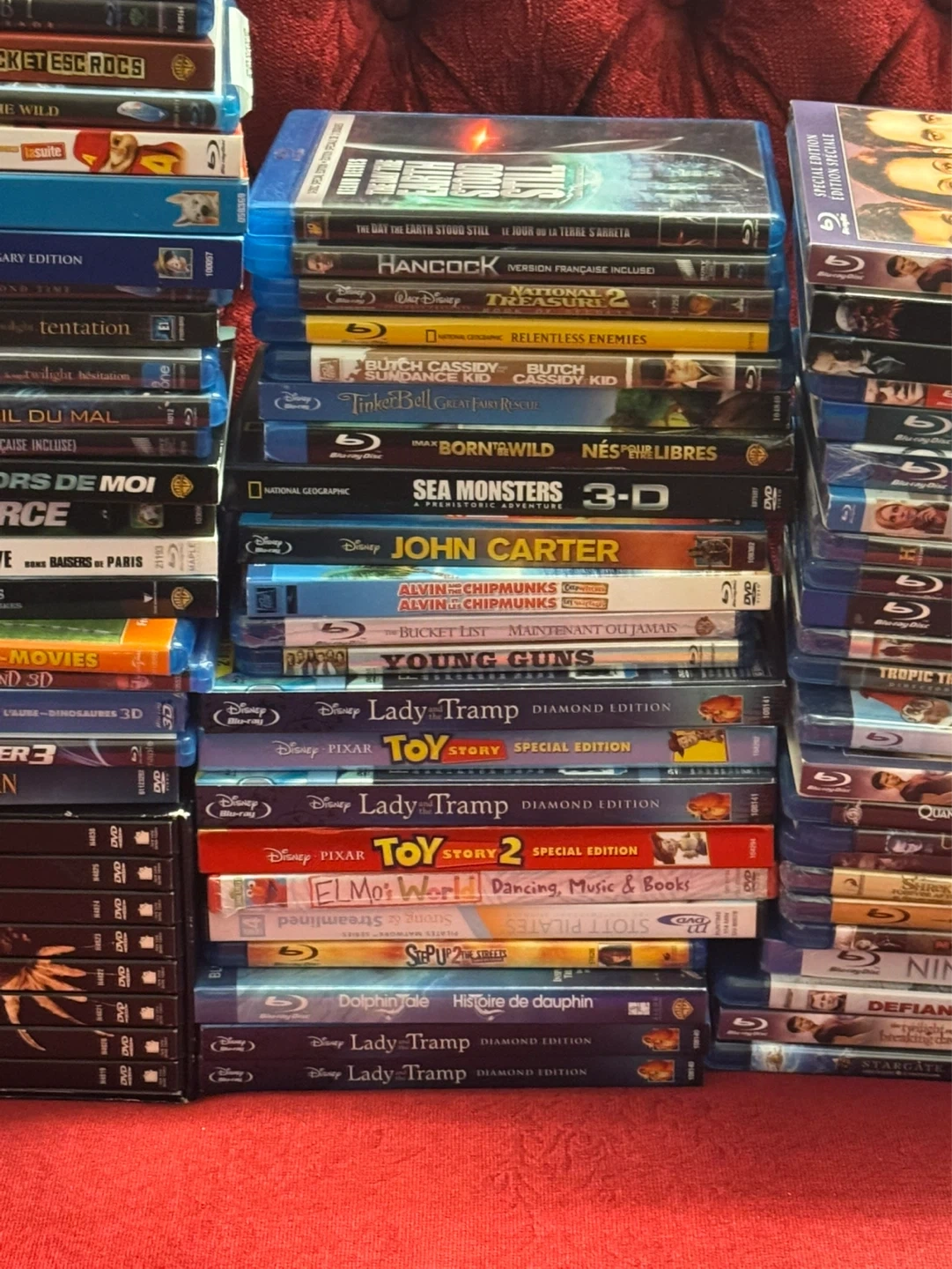 This is a large collection of Blu-ray and DVD movies across various genres. Titles include 'Avatar', 'Shrek', 'Toy Story' series, and many more. The collection offers a wide variety of entertainment options for movie lovers. Many of these are special editions and platinum collections.