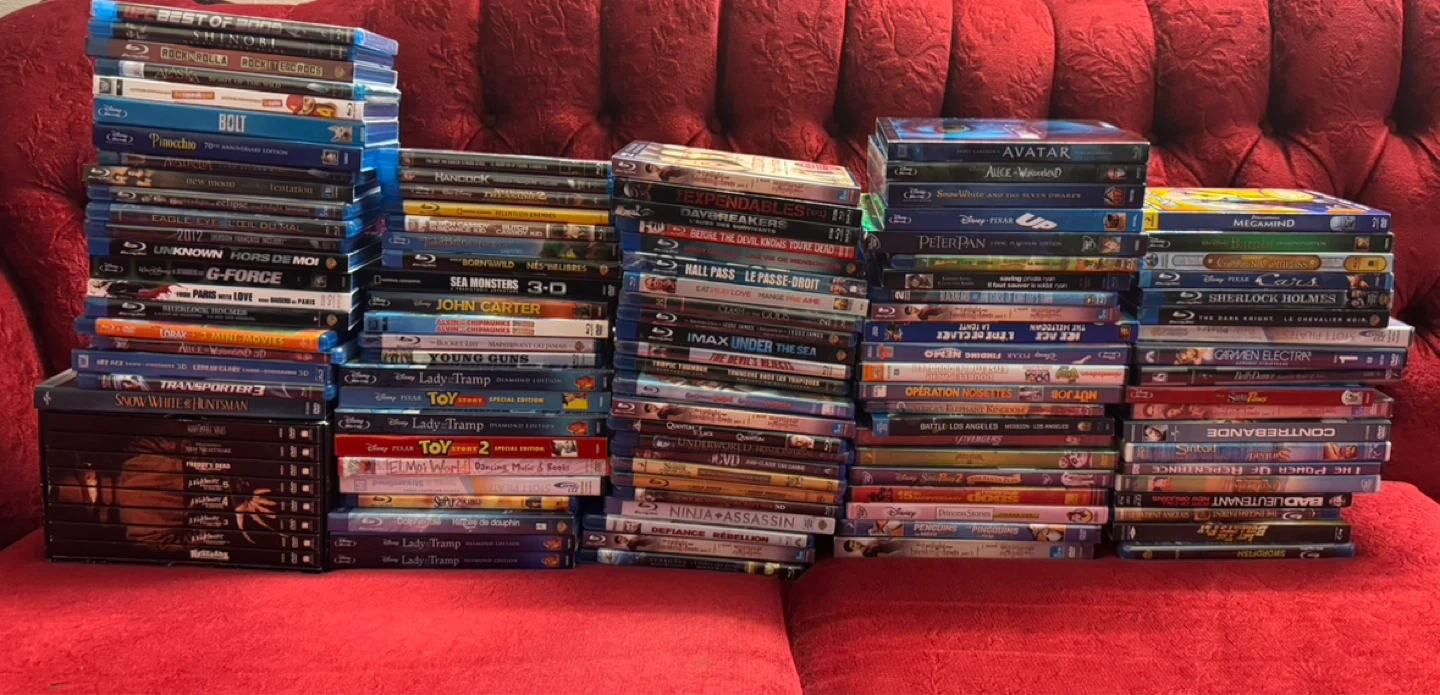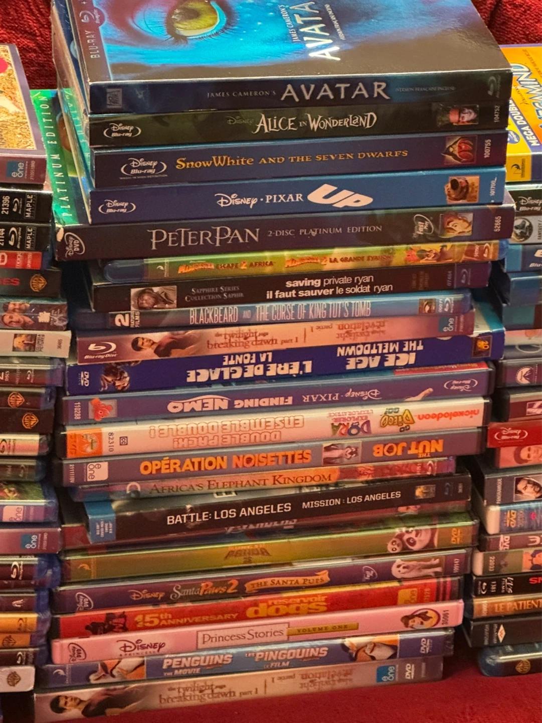 This is a large collection of Blu-ray and DVD movies across various genres. Titles include 'Avatar', 'Shrek', 'Toy Story' series, and many more. The collection offers a wide variety of entertainment options for movie lovers. Many of these are special editions and platinum collections.