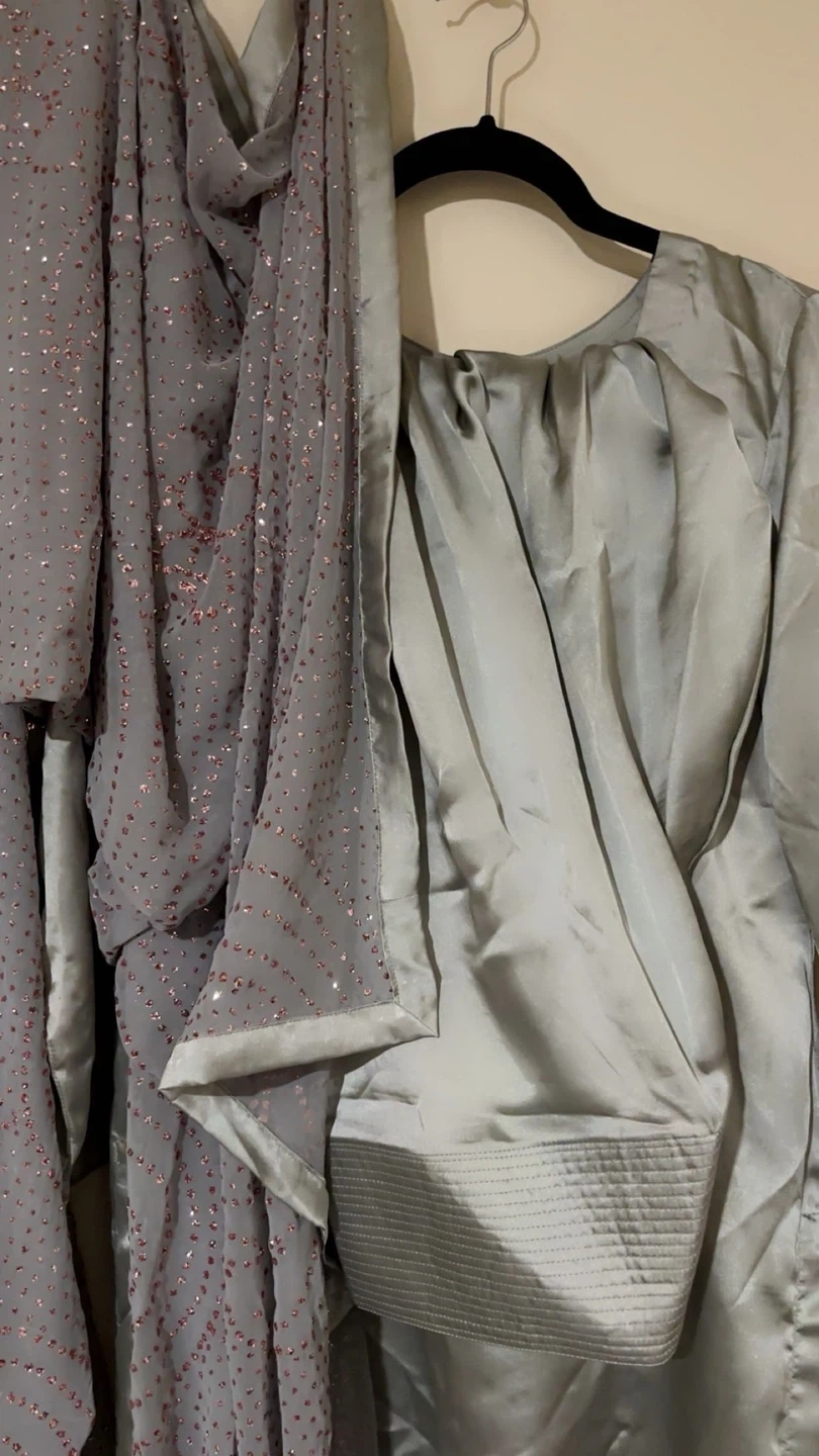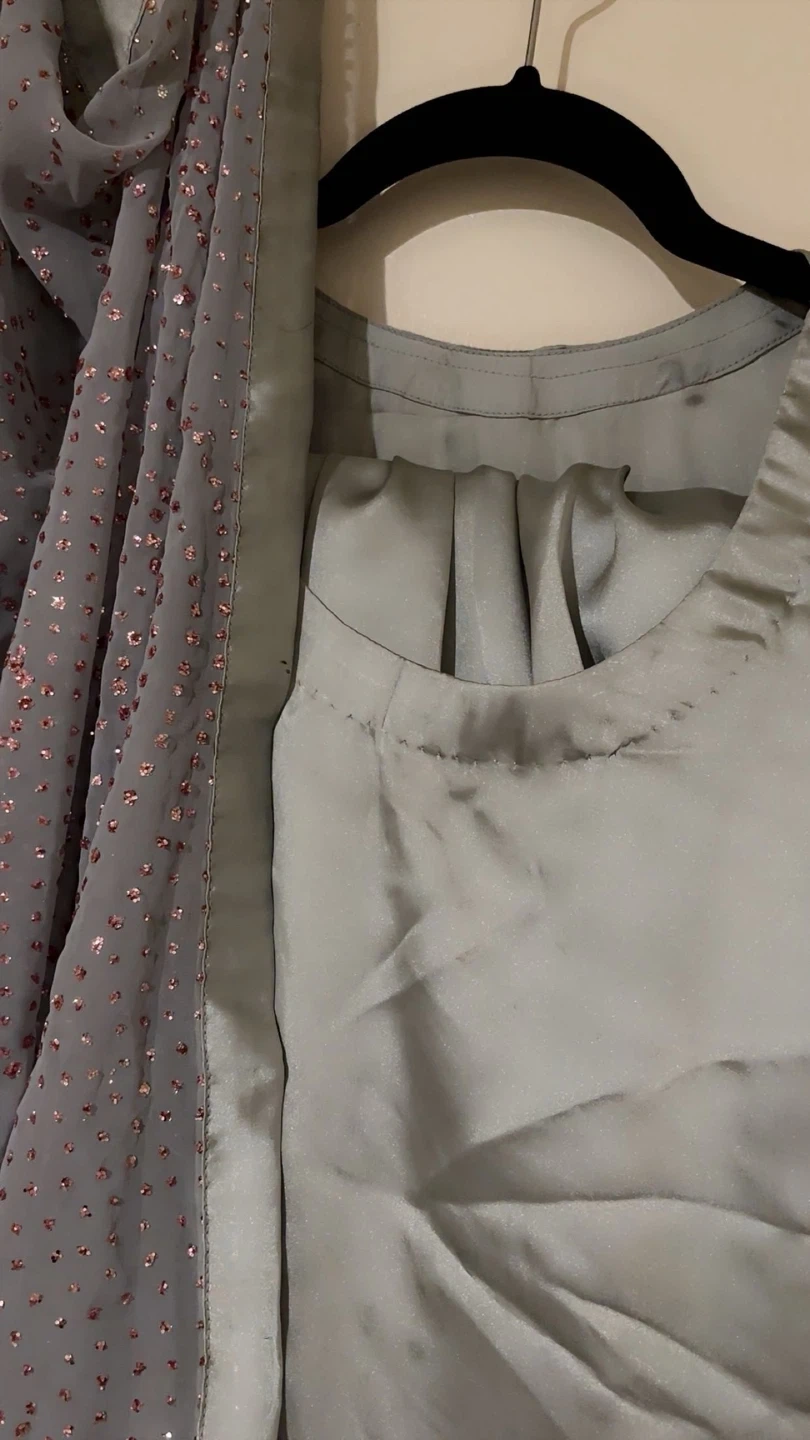 This is a three-piece women's outfit featuring a kameez, salwar, and dupatta. The kameez and salwar are a light grey raw silk material. The dupatta is a grey sheer fabric with scattered rose gold embellishments. It's suitable for special occasions like eid, desi/brown parties, gatherings , iftar, parties n diwali