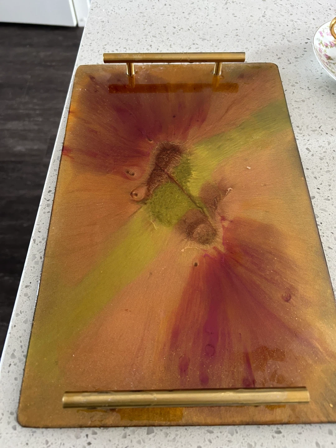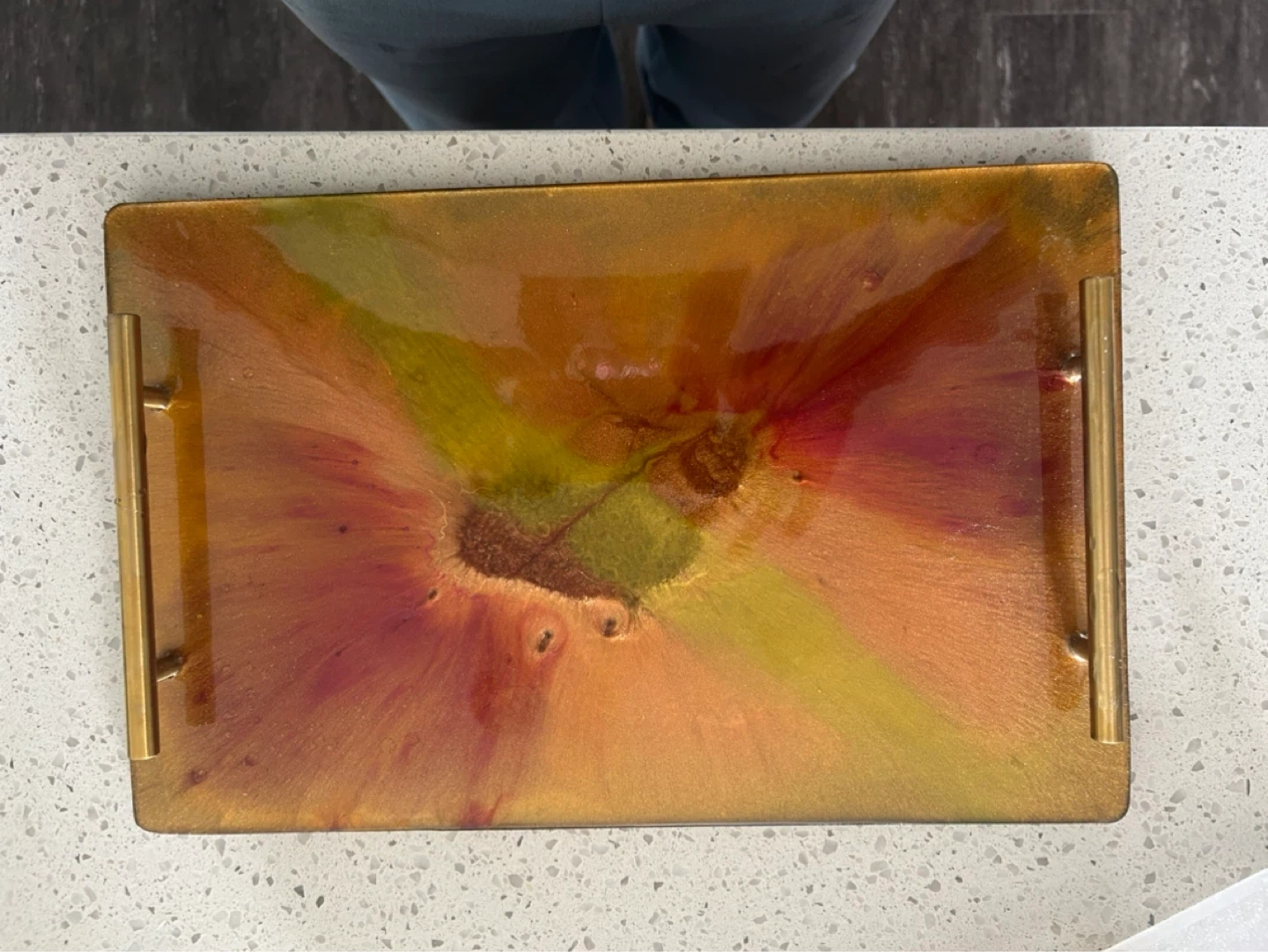 A decorative resin serving tray with a vibrant, abstract design. It features two gold-toned handles for easy carrying. This tray would be lovely for serving drinks or as a decorative piece on a coffee table.handmade.