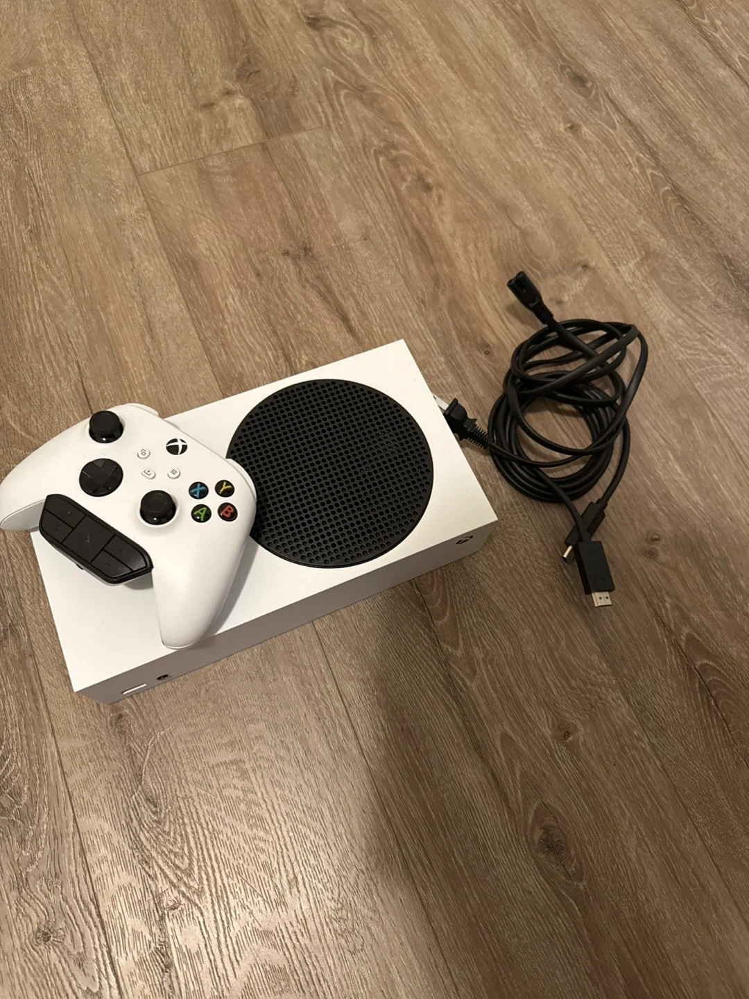 This is a white Xbox Series S console. It comes with one wireless controller and a power cable. It's ready for gaming!