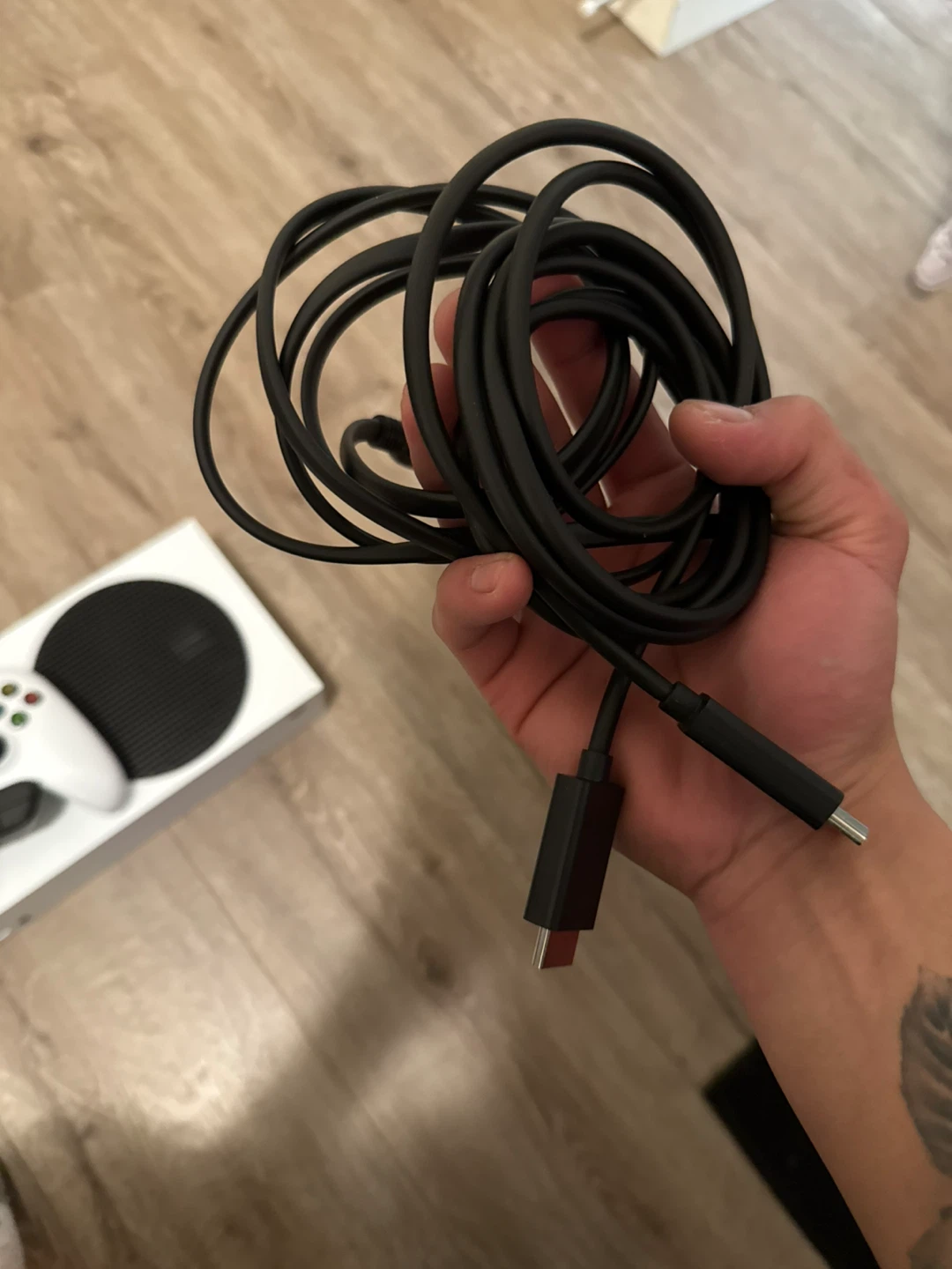 This is a white Xbox Series S console. It comes with one wireless controller and a power cable. It's ready for gaming!