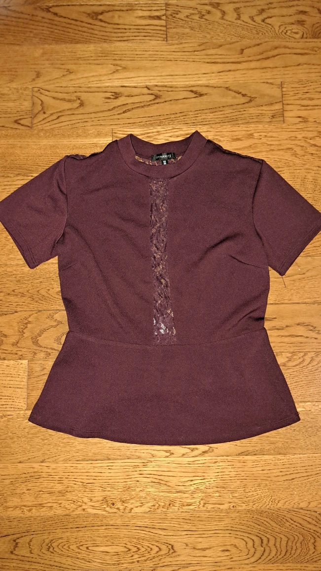 Here's a lovely burgundy top from Dynamite. It features a beautiful lace design on the back and front. The size is P/S. Excellent condition.