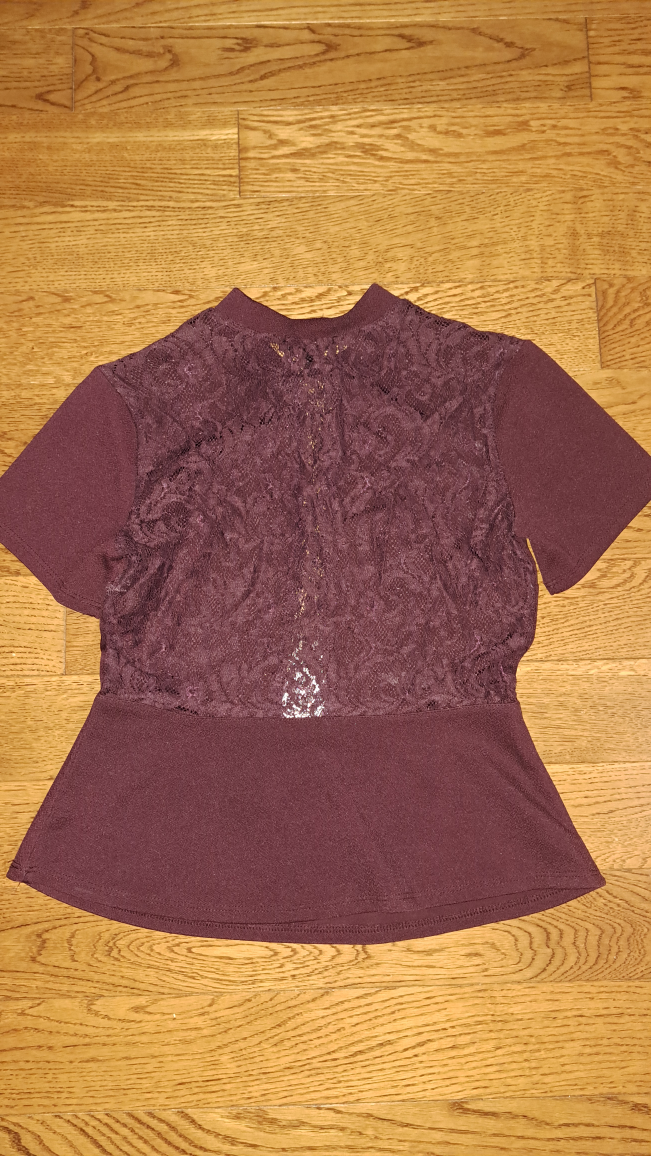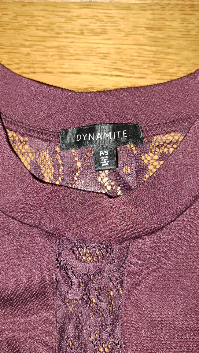 Here's a lovely burgundy top from Dynamite. It features a beautiful lace design on the back and front. The size is P/S. Excellent condition.
