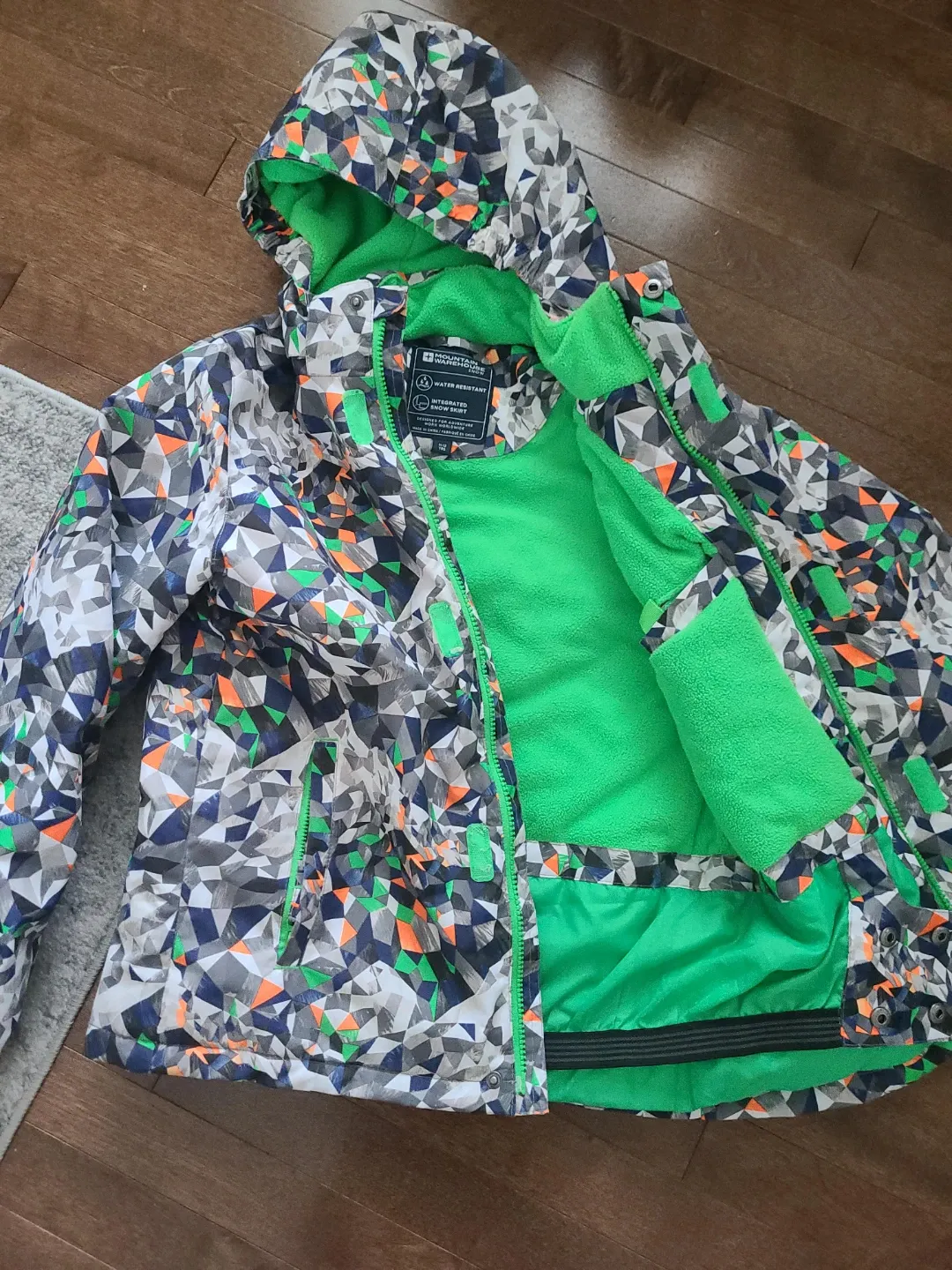 This is a Mountain Warehouse ski jacket. It's water resistant and features an integrated snow skirt. Designed for kids, it has a bright, geometric pattern and a green fleece lining. Great for hitting the slopes! Youth size 11-12