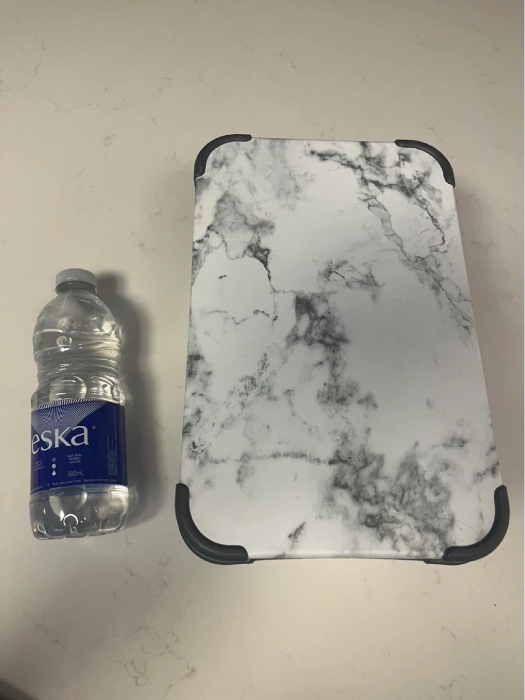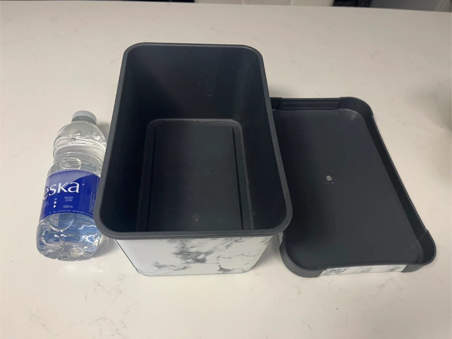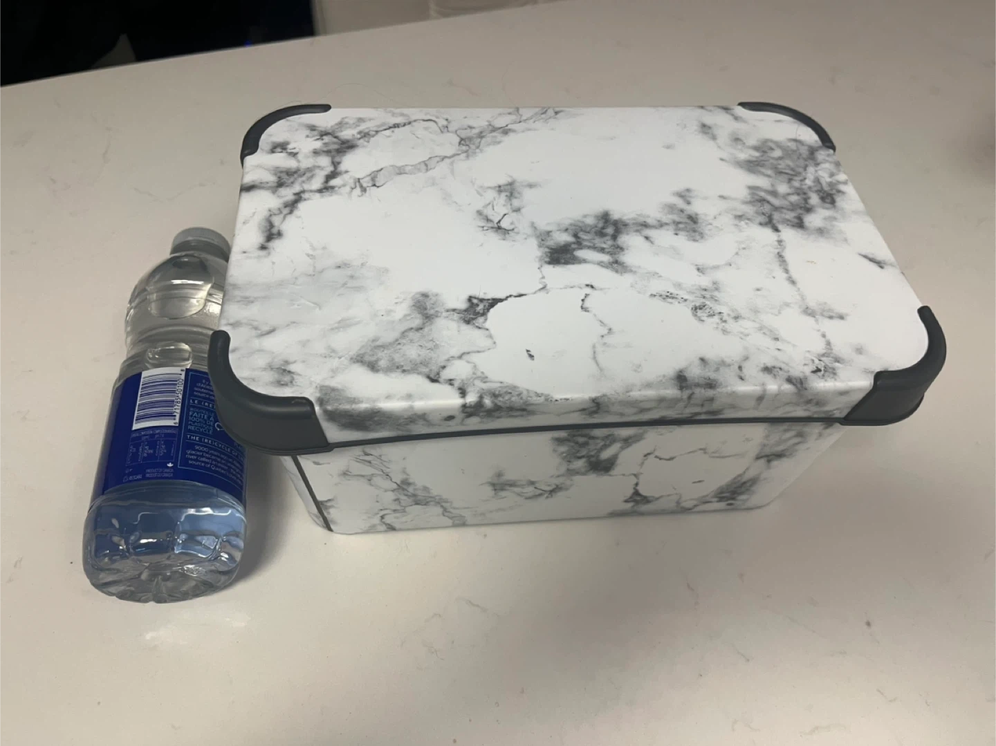Marble print food storage container with a lid. Features a durable plastic construction. Includes a 500ml water bottle for size reference. Great for packing lunches or storing leftovers!