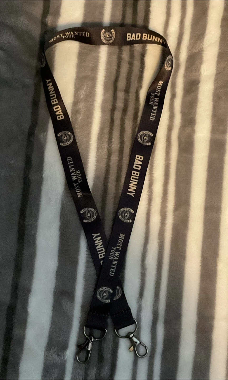 This is a Bad Bunny Most Wanted Tour lanyard. It's made of black fabric and features the tour name and artist branding. It has metal clasps for attaching items. Looking to get $40 cash obo please. Pickup in Oakwood Village. Thanks.