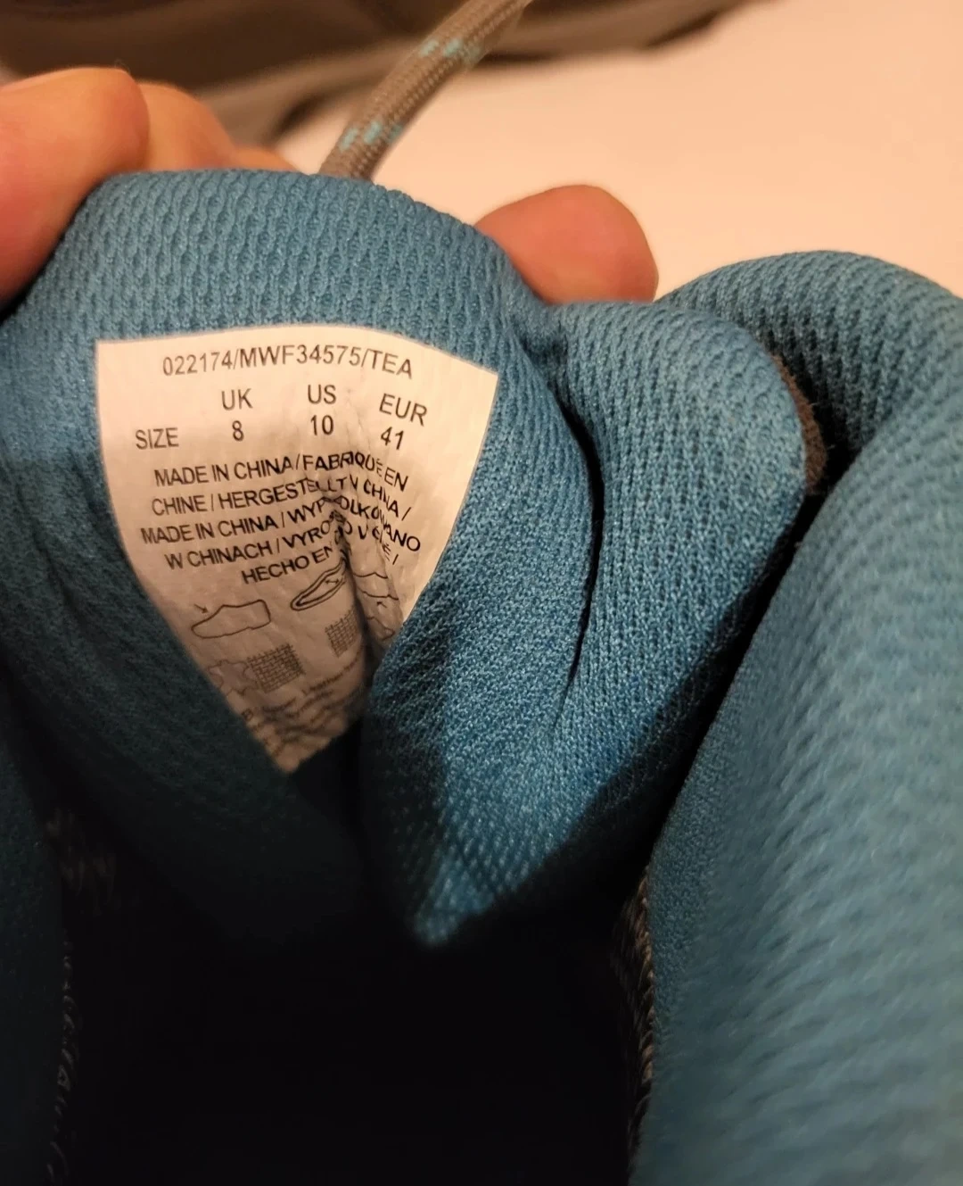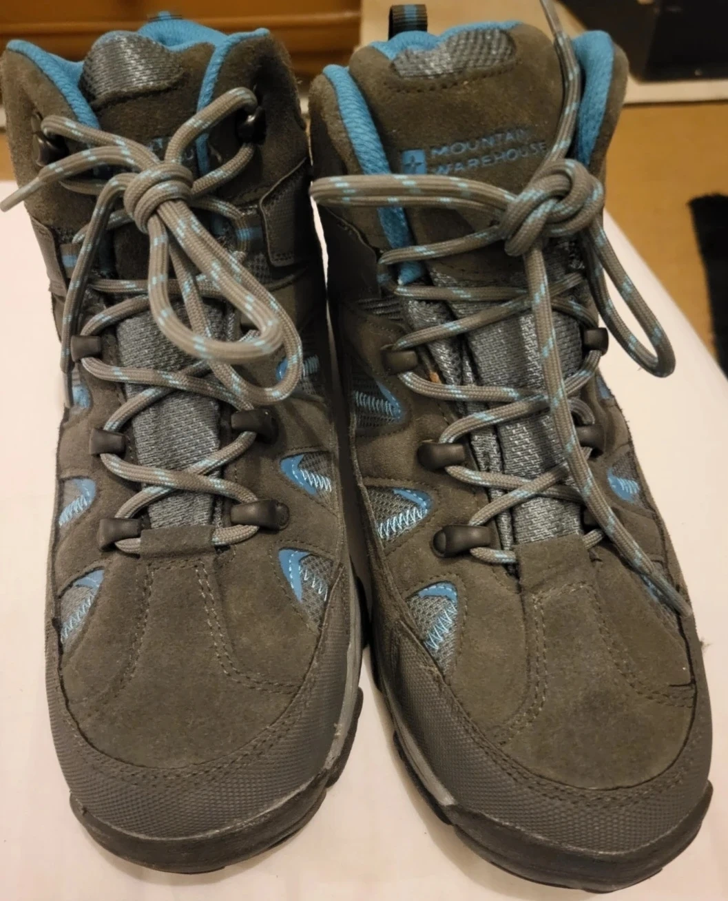 Grey and blue Mountain Warehouse hiking boots with a sturdy sole. Women's size 8 UK, 10 US, 41 EUR. Great for hitting the trails!