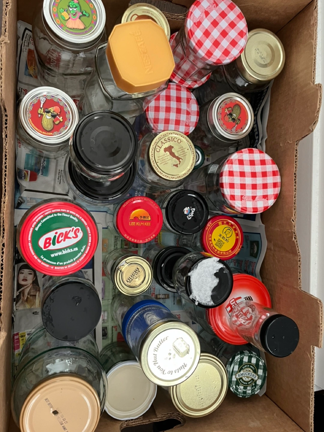Giving away mixed glass jars! There's a variety of brands like Bick's, Smucker's, Classico, and a Nescafé jar. Great for canning, storage, or crafts.