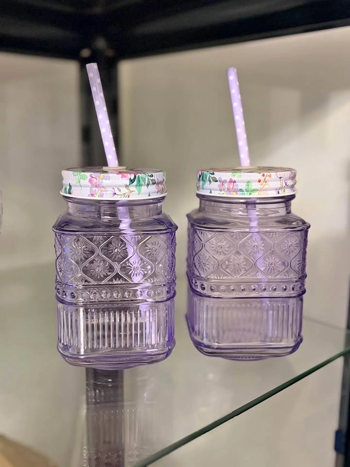 Beautiful purple glass tumblers with embossed floral pattern. Set includes two square-shaped jars with matching floral metal lids and purple polka dot straws. Glass is thick and durable with a vintage-inspired design. Pickup in Sunset, Vancouver.