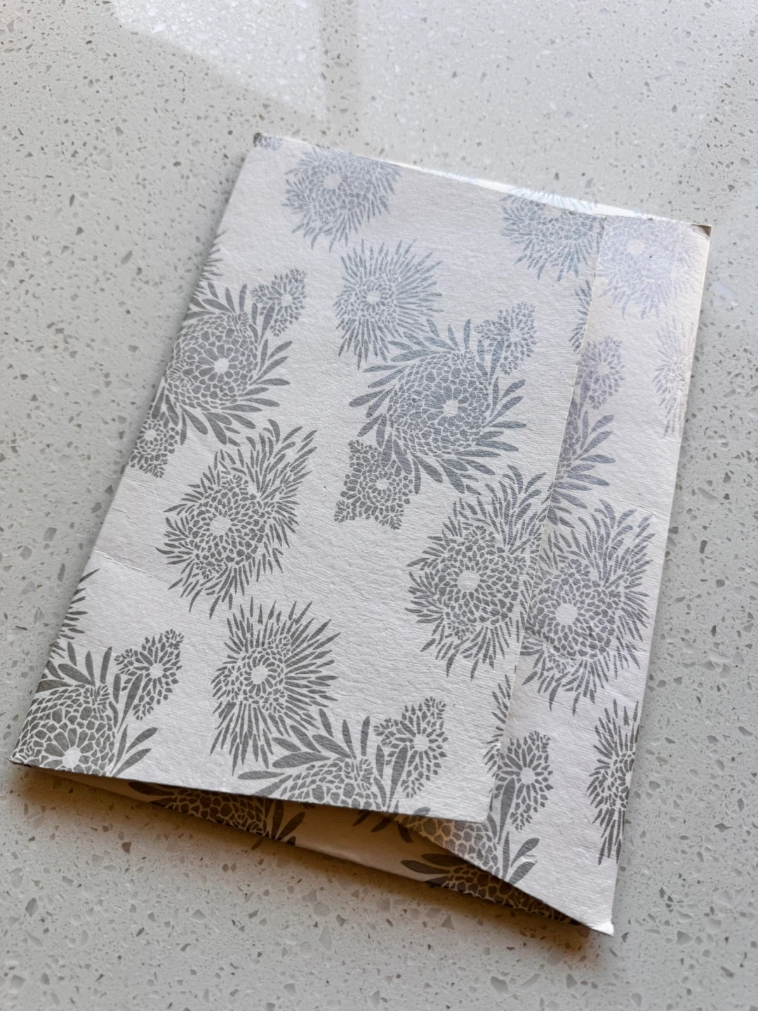 Pretty handmade stationery set featuring textured paper with natural fibres. It includes 2 sheets of paper and 3 envelopes, perfect for sending thoughtful messages. The set has a unique floral design on the envelopes.